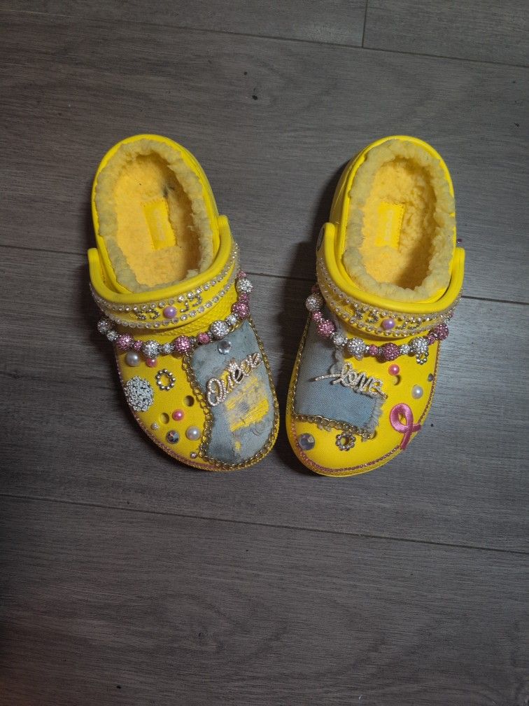 These are a pair of yellow Crocs size 4M/6W that have been uniquely customized with intricate decorations. They feature fur-lined interiors for added comfort. The exterior is adorned with a variety of embellishments, including rhinestones, pearls, and sparkling bead chains around the straps. Both shoes have denim patches attached to the tops, with metallic charms spelling "Queen" and "Love" respectively. Other decorative details include a pink ribbon symbol and various colorful accents, giving the shoes a bold and personalized look.
