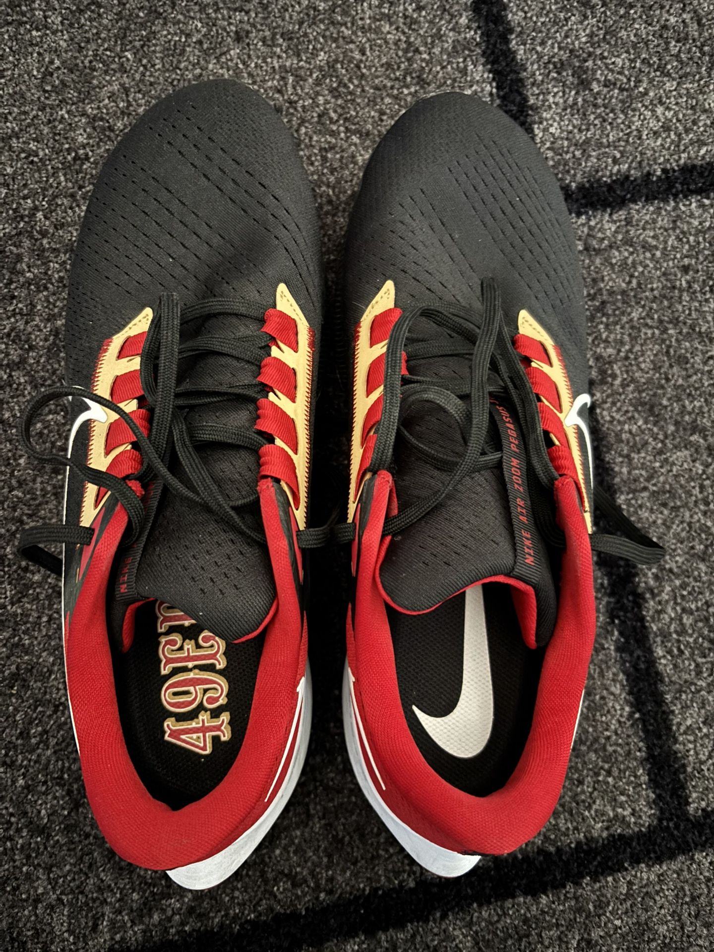 Nike Pegasus 38 san francisco 49ers running shoes sneakers mens size 12. Used wore them less than a dozen times still plenty of tread. Mainly wore them to watch games on sundays No box asking $50 obo Located in city of industry
