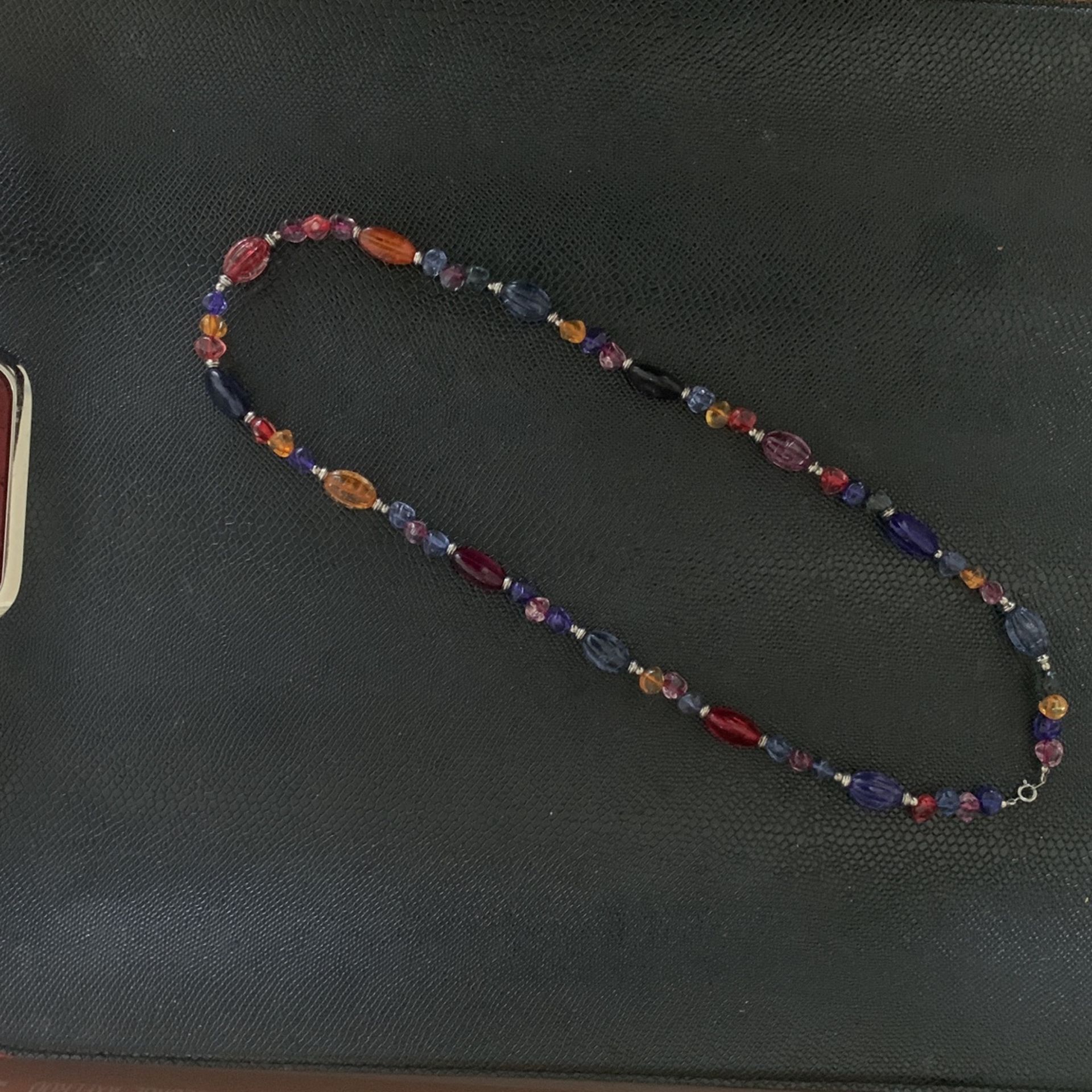 Amber ruby cobalt blue onyx tone faux hard plastic bejeweled tone beads Can be worn as a bracelet too and has a classic gold tone clasp colors are really pretty We consider offers