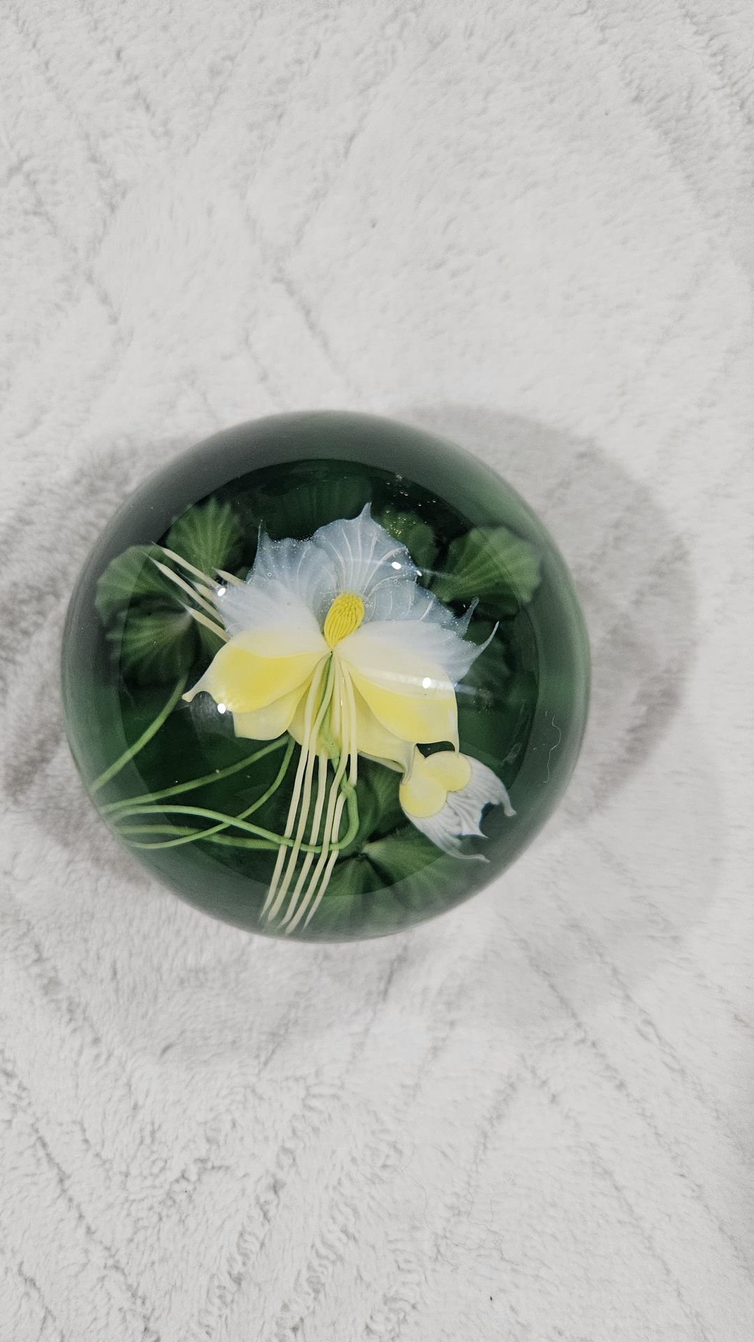 Very great condition. Unique one of a kind Paperweight. Greens and yellow colors make it pop.