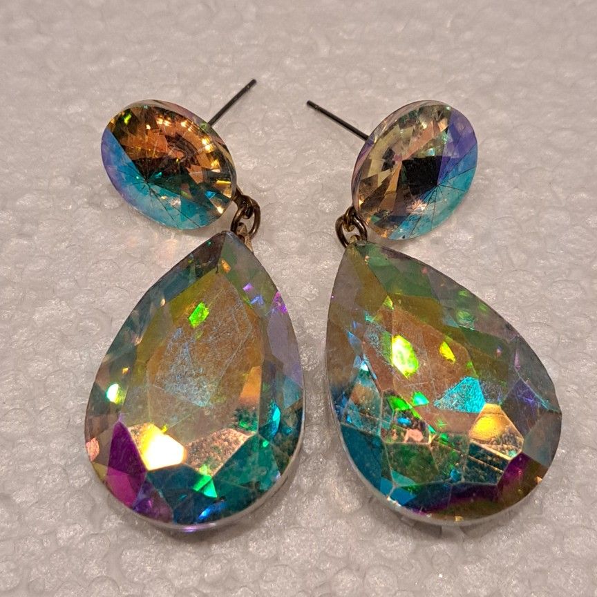The Aurora Borealis Iridescent Stud Statement Dangle Fashion Earrings are a beautiful and eye-catching accessory perfect for various occasions such as weddings, anniversaries, and birthdays. The multicolor glass stones in teardrop shape add a touch of beauty and elegance to any outfit. These earrings are secure with stud closure and come in a set of two earrings, making them a versatile and stylish addition to any jewelry collection. Condition is pre-owned with some signs of wear. Lightweight, possibly plastic stones. Listing as fashion jewelry. Refer to pictures for details.