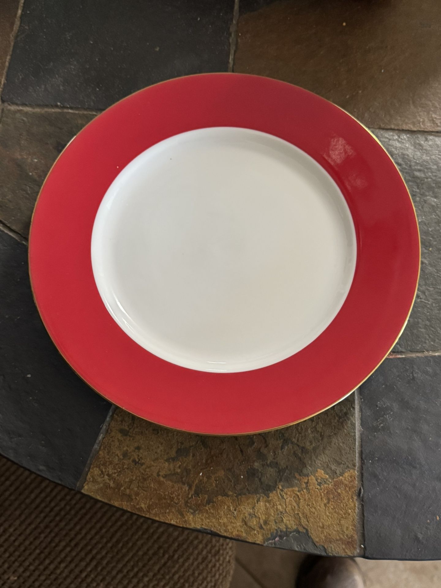 This set contains 8 dinner plates that are white in the center with the outer band in red with the edge in a gold trim These plates measure approximately 10 inches in diameter Brand - Ten Strawberry Street LTD These 8 plates are dishwasher and oven safe Also Included in this set are 2 solid white plates with designs on the outer ring with gold trim These plates measure approximately 11 inches in diameter Brand - Nikko White Lace Condition - New/Used They are listed this way because they have never been used except for display/decoration. The plates also come with a white plate storage bag, however the zipper is off track.