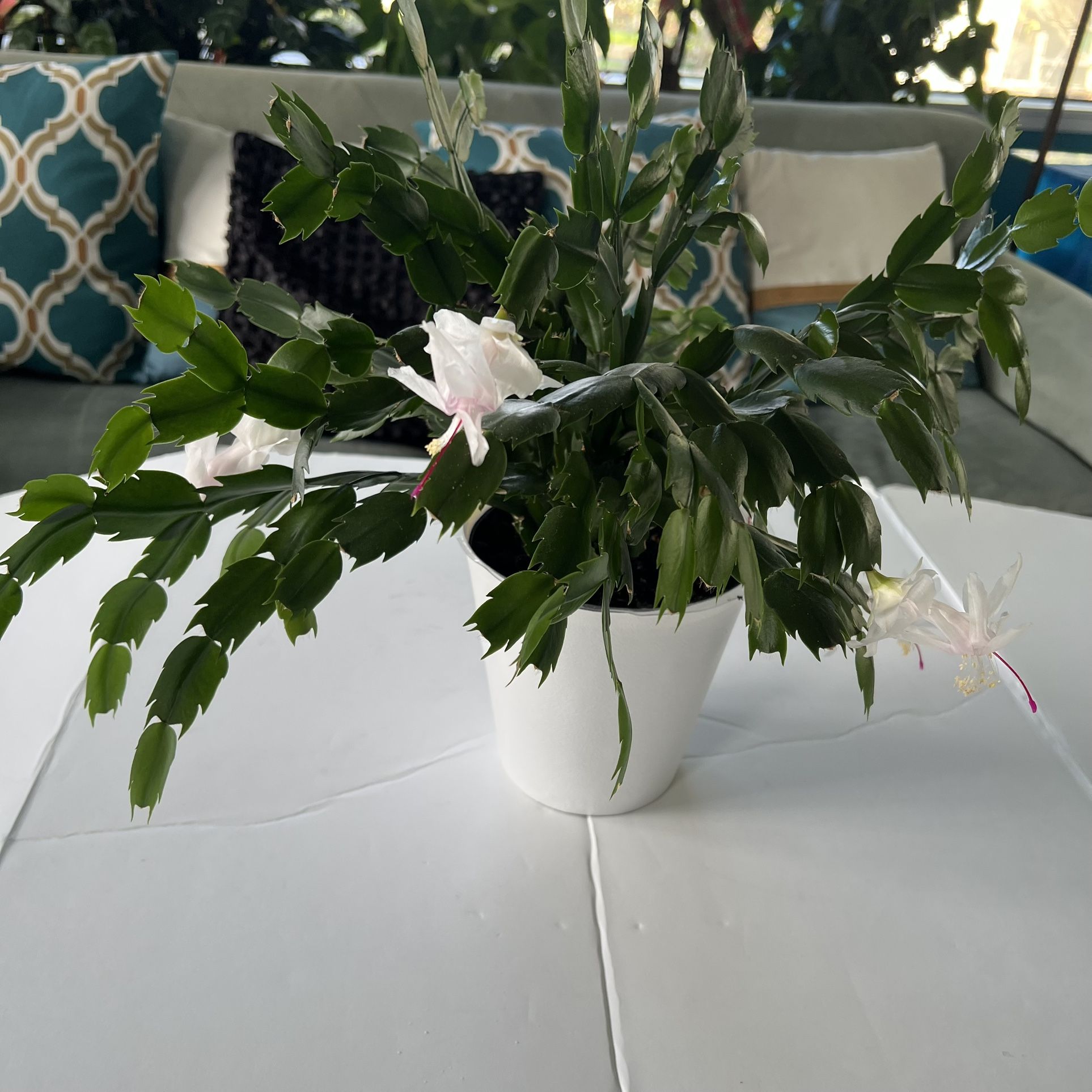 Potted live flowering Christmas Cactus white flowers in bloom white with pink tip inside. Approximately 17” inches tall 21” inches wide foliage Pot 10.5 inches x 5.5 inches