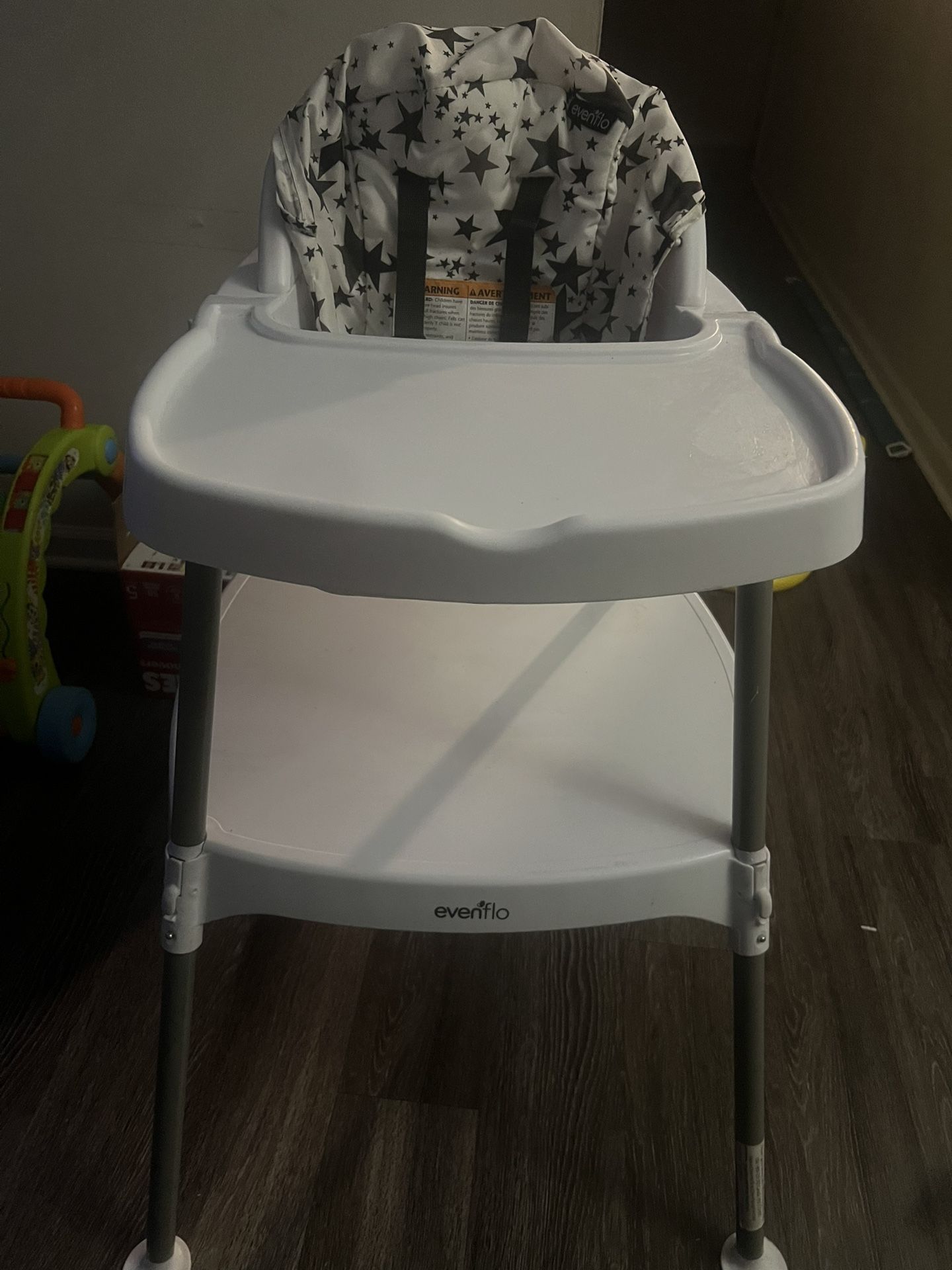 Even Flo high chair. White with black stars. Top and bottom can detach to become chair and table. Pick up ASAP. Orion ParkView Apartments on Golf Rd in Mount Prospect.