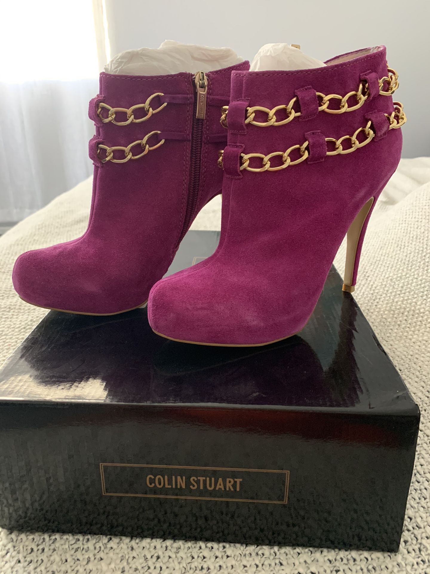 Colin Stuart fuchsia suede leather booties with golden chains size 7.5