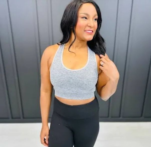 Stay comfortable and supported during your workouts with this adorable sports bra. The grey color complements any outfit, while the scoop neck and racerback provide a flattering fit with textured details. Built-in support and a soft, stretchy fabric make this bra perfect for layering or wearing on its own. Wear it with workout shorts and sneakers on warm days, or style it under a tank or tee with leggings for your next workout! Size is 1XL #8