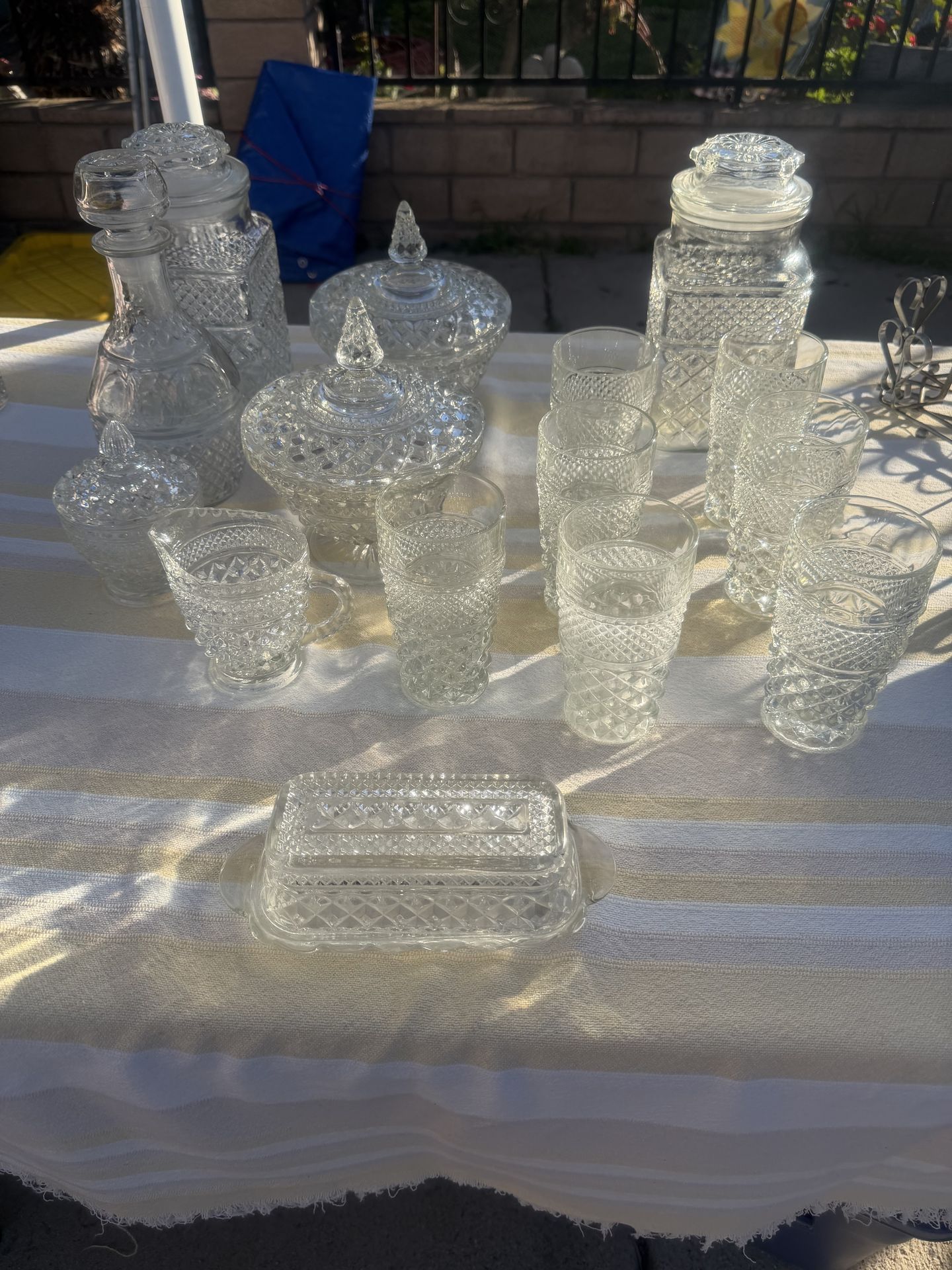 Candy jars, cups, wine bottle, butter container, Sugar and crème pour. All items pictured sold as a set. Pick up only, Dm for address!