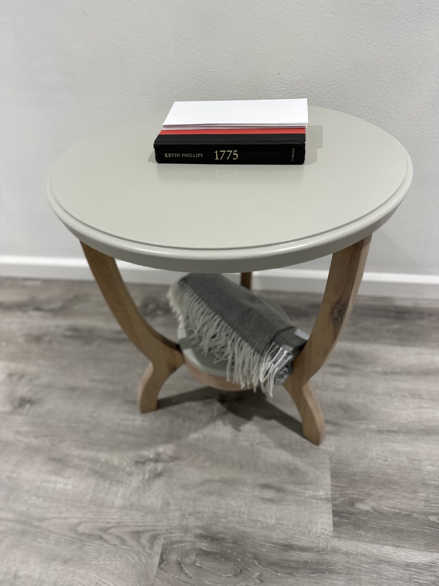 Elegant, perfect size, round table in beautiful color of Waco by Magnolia This gem will fit perfectly into your space and highlight the natural beauty of raw wood with elegant touch of morning mist color Legs are solid wood Top is solid wood with mdf layer 24” diameter 25” height