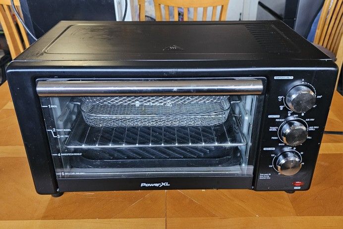 PowerXL Toaster Oven & Air Fryer Combo – Compact & Powerful Perfect for small spaces, apartments, or anyone who needs a quick, easy cooking solution. This unit is in good used condition, tested and working great. It heats up fast and can air fry, toast, bake, broil, or reheat with ease. Approx. dimensions: 10.5” H x 13.5” D x 19” W Spacious interior fits a personal pizza, 4 slices of toast, or small baking trays Adjustable temperature and timer settings Easy-to-clean crumb tray Sleek design fits on any countertop Minor cosmetic wear from normal use but overall clean and functional. Great for dorm rooms, RVs, or backup cooking needs.