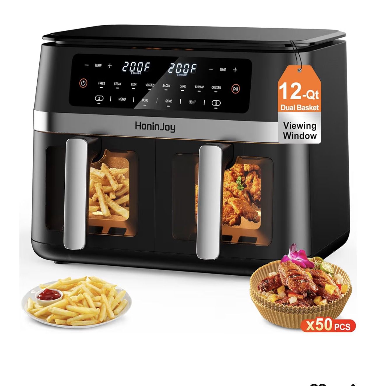 12QT Large Dual Basket Air Fryer with Viewing Window and 50pcs Paper Liners, 10-in-1 Digital Touchscreen Double Zone Air Fryers, SyncCook to Bake,Roas