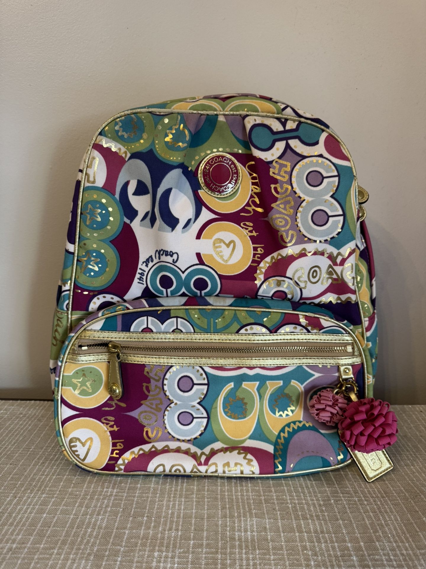 Coach signature Poppy C limited edition backpack Features vibrant pattern, gold accents and a playful design. 🌟PLEASE READ- Everything in clean, wonderful condition except the gold accent on straps and throughout are flaking. (see picture)