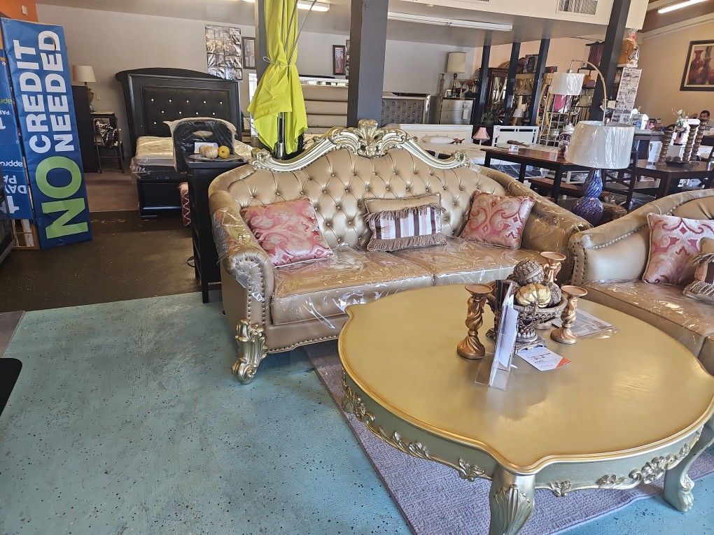 Sofa,love seat, bone pu &gold platina finish. Was 6,799