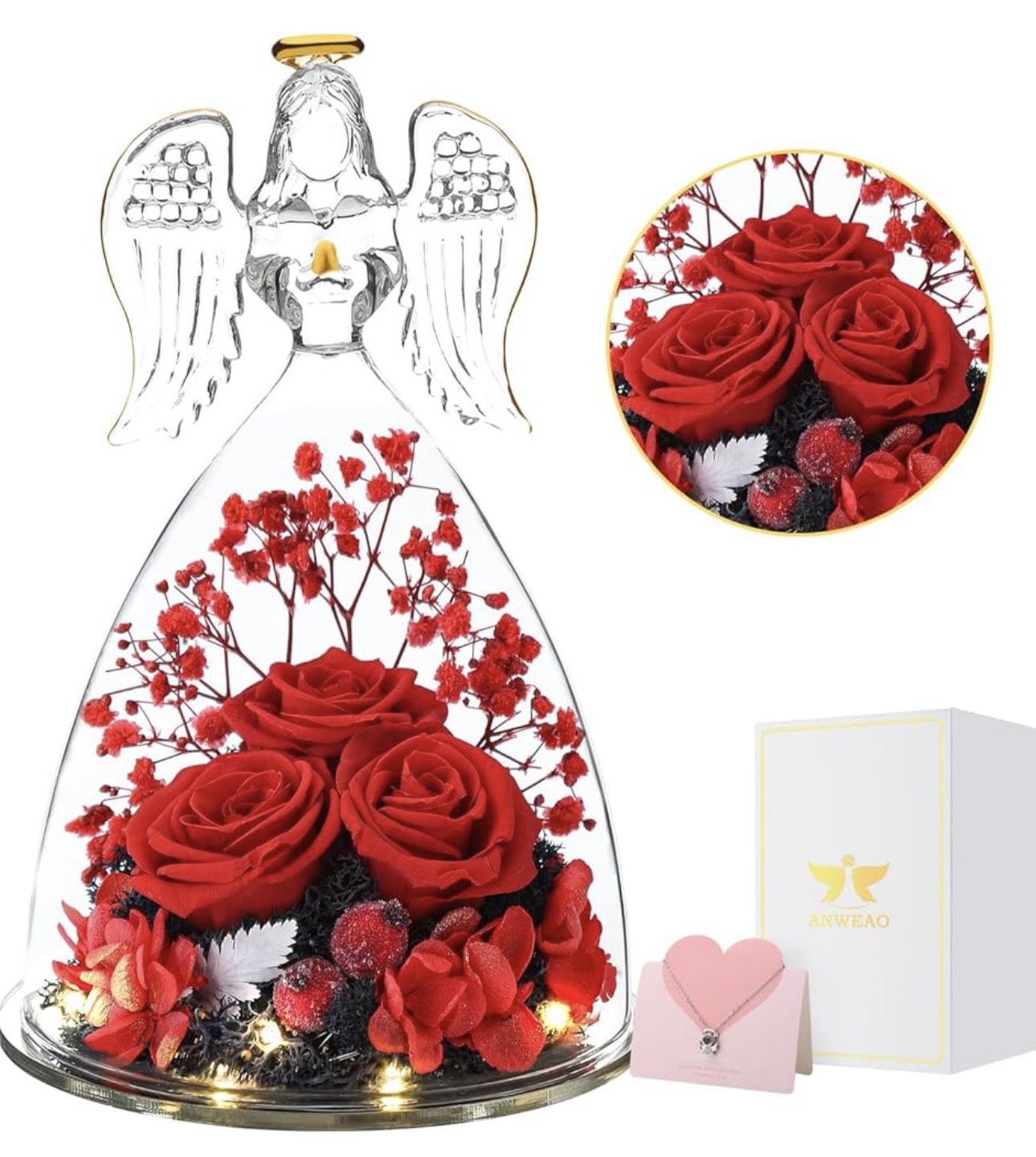 Valentines Day Gift for Women - Preserved Rose Forever Flower in Glass Angel Figurine