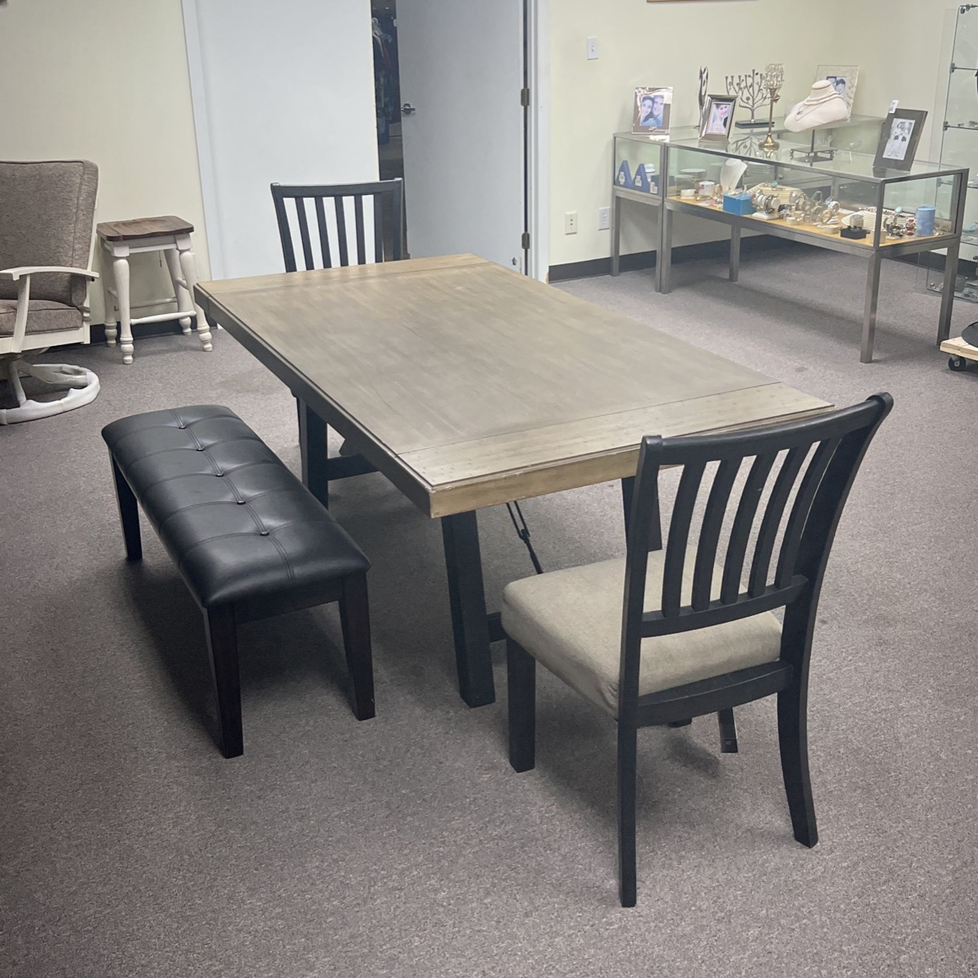 Table, 2 chairs, bench