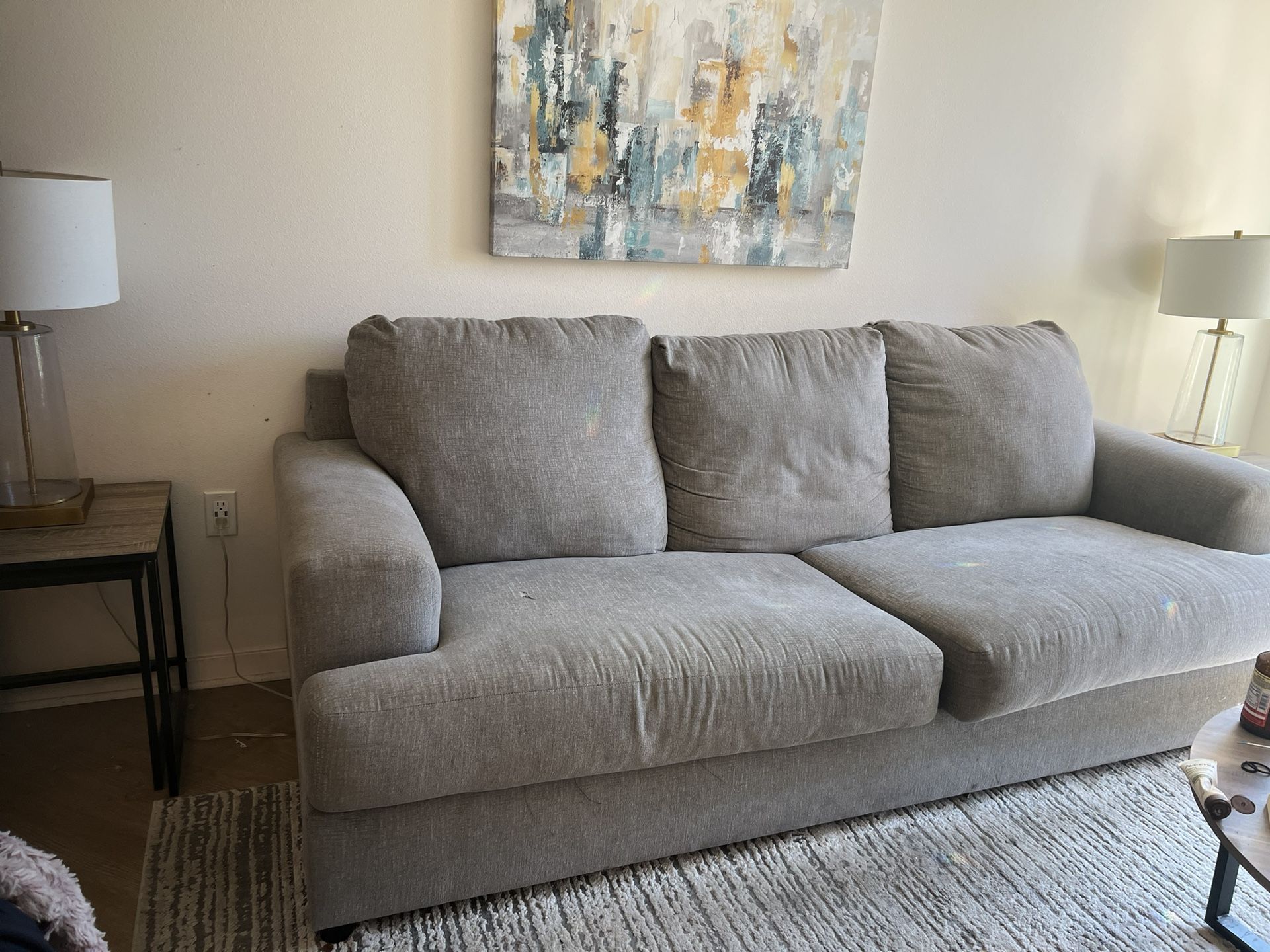 Hi all. I’m in the process of moving in a couple weeks and I have a wonderful couch that I’ve had for about four years. It’s in just regular wear and hair but in good condition. Comes with two pillows as well for an additional $50 for $150. I will include the two tables and lamps. Those are like brand new barely touched.