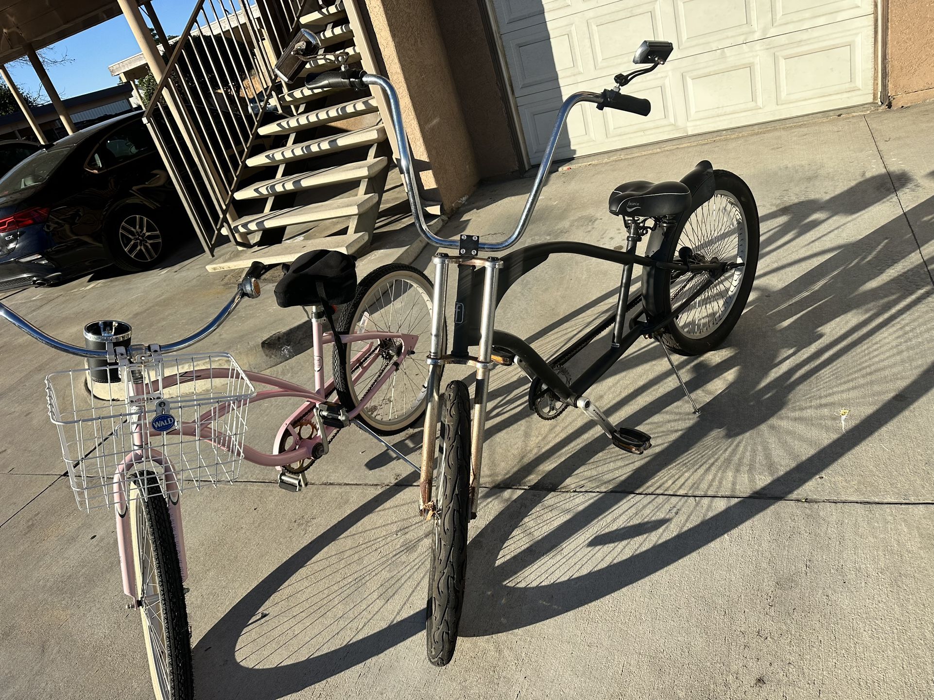 Matching men’s and women’s cruiser bikes in great riding condition. Includes a black Firmstrong men’s cruiser and a pink Electra women’s cruiser — perfect for couples, boardwalk riding, or neighborhood cruising. Both bikes are complete, straight, and ready to ride. • 26” balloon tires • Comfortable cruiser saddles • Coaster brakes (simple & reliable) • Electra includes a front basket • Firmstrong has tall cruiser bars Some normal surface rust from storage. Selling as a set — not splitting.