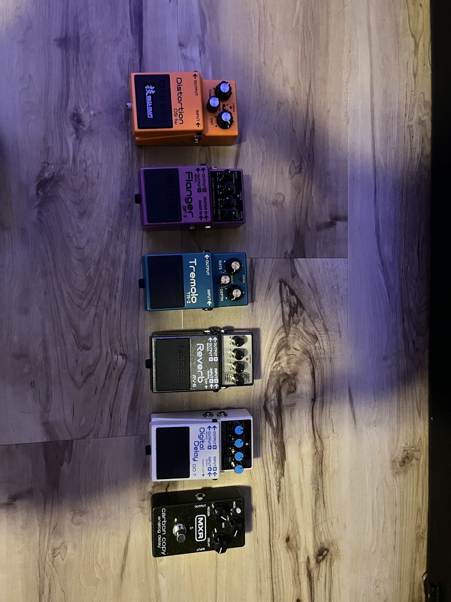 MXR Carbon Copy (Analog Delay) $100-$130 BOSS DD-7 Digital Delay $120-$150 BOSS RV-6 Reverb $120-$150 BOSS TR-2 Tremolo $80-$100 BOSS BF-3 Flanger $90-$120 BOSS DS-1W (Waza Craft Distortion) $120-$150