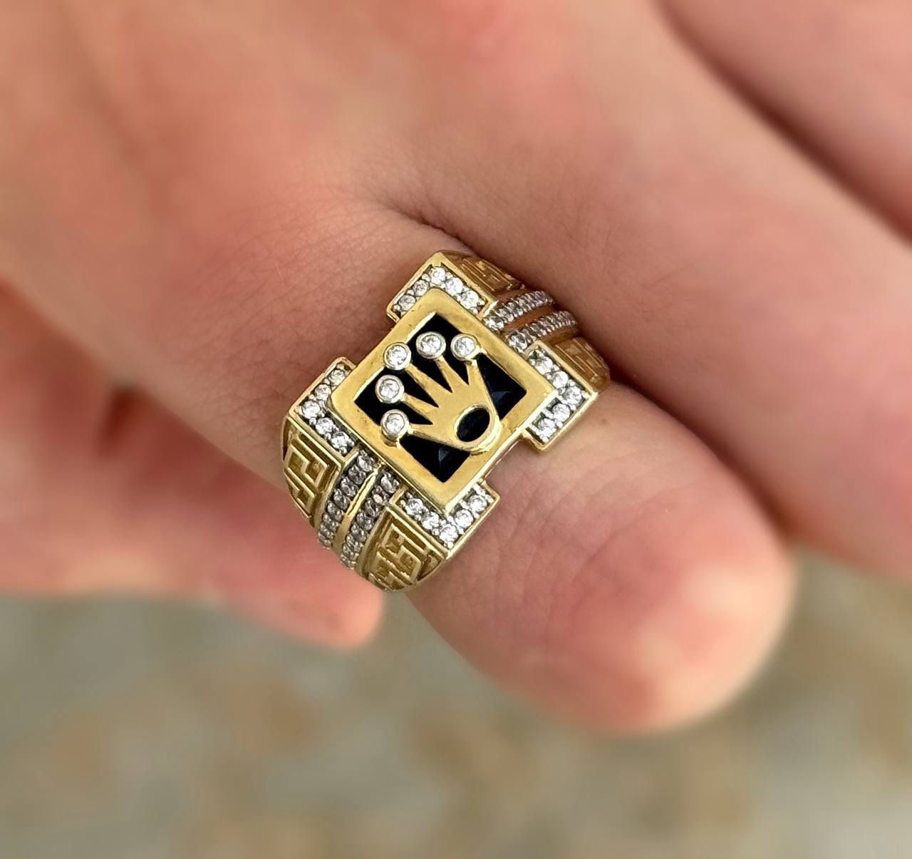 This gorgeous crown Rolex ring with blue sapphire and white CZ stones ring is made of 10k solid yellow gold. Total weight: 8.30grams. βοΈππ. Total carat weight of the white CZ stones is approximately 0.80CT. πππ It is very beautiful piece. looks very gorgeous π₯ Perfect gift! β€οΈππ We buy Rolex and Audemars, patek . Do layaway in VIP PAWN Coral Springs π₯ππΈ
