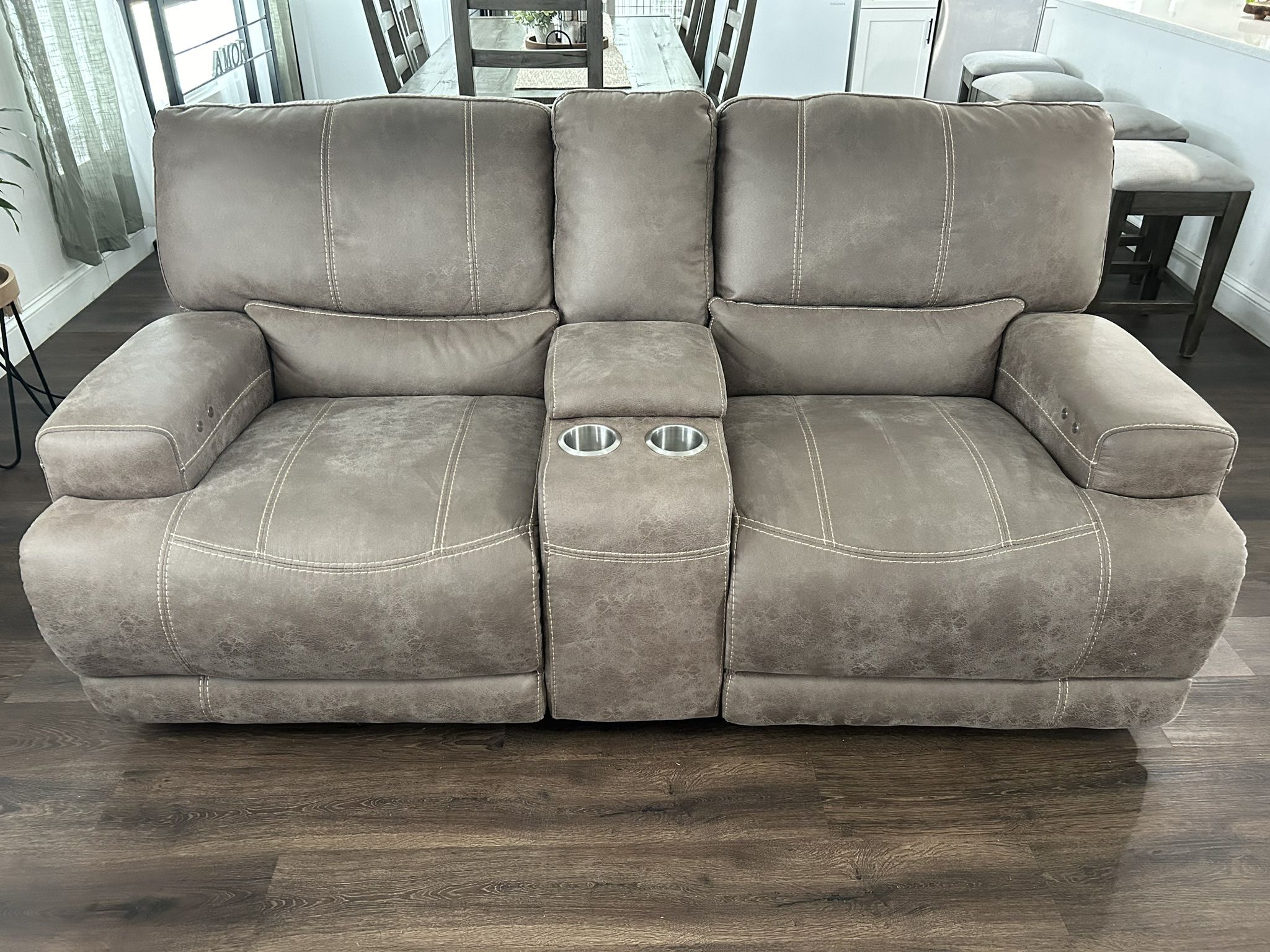 Selling 2 Light brown/Gray Love seat recliners. Each love seat has 2 automatic reclining chairs with a center console & 2 cup holders. Great for a theatre room! All recliner functions work perfect and in good condition. Each loveseat can be sold separately. $500 each, not negotiable. Pick up only, no deliveries!