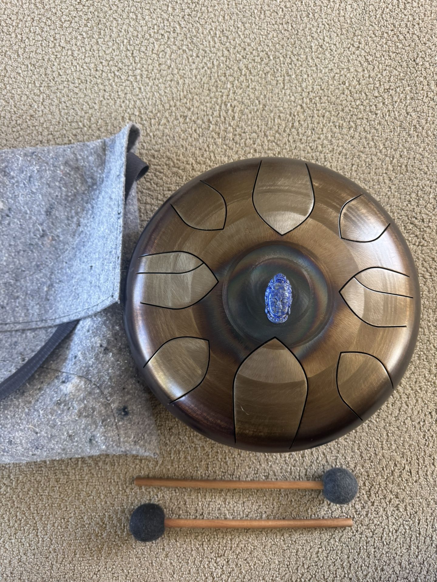 Powerful tongue drum handmade by Myko Mystic of Chroma Drums. You can place on the body and play or next to. Use mallets or hands! Comes with mallets and felt carrying case buddha inlay emblem!