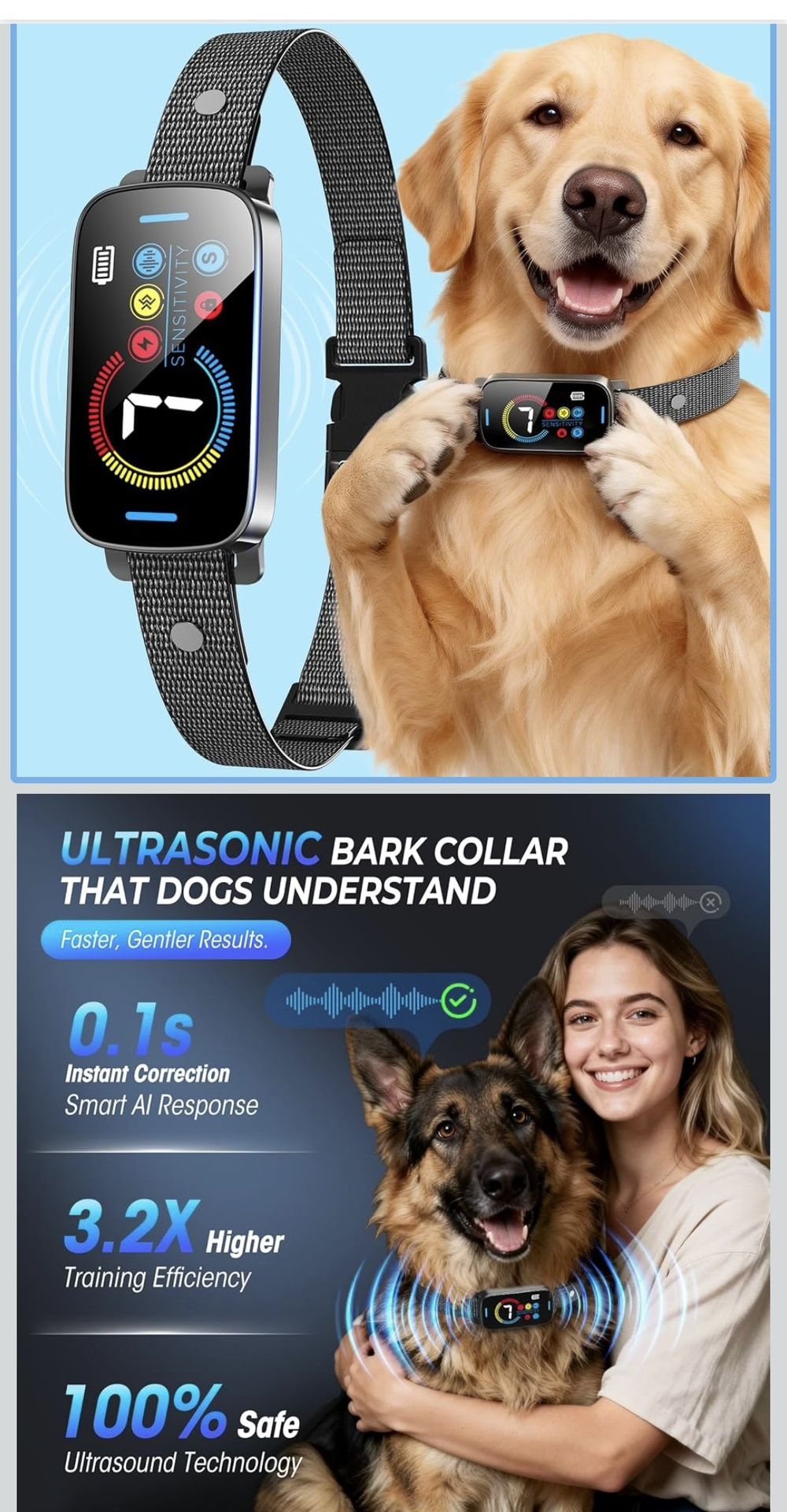 Ultrasonic Bark Collar for Large Medium Small Dogs, Humane Fast & Gentle Anti Bark Collar with Beep & Vibration, Smart Barking Collar with 7 Adjustabl