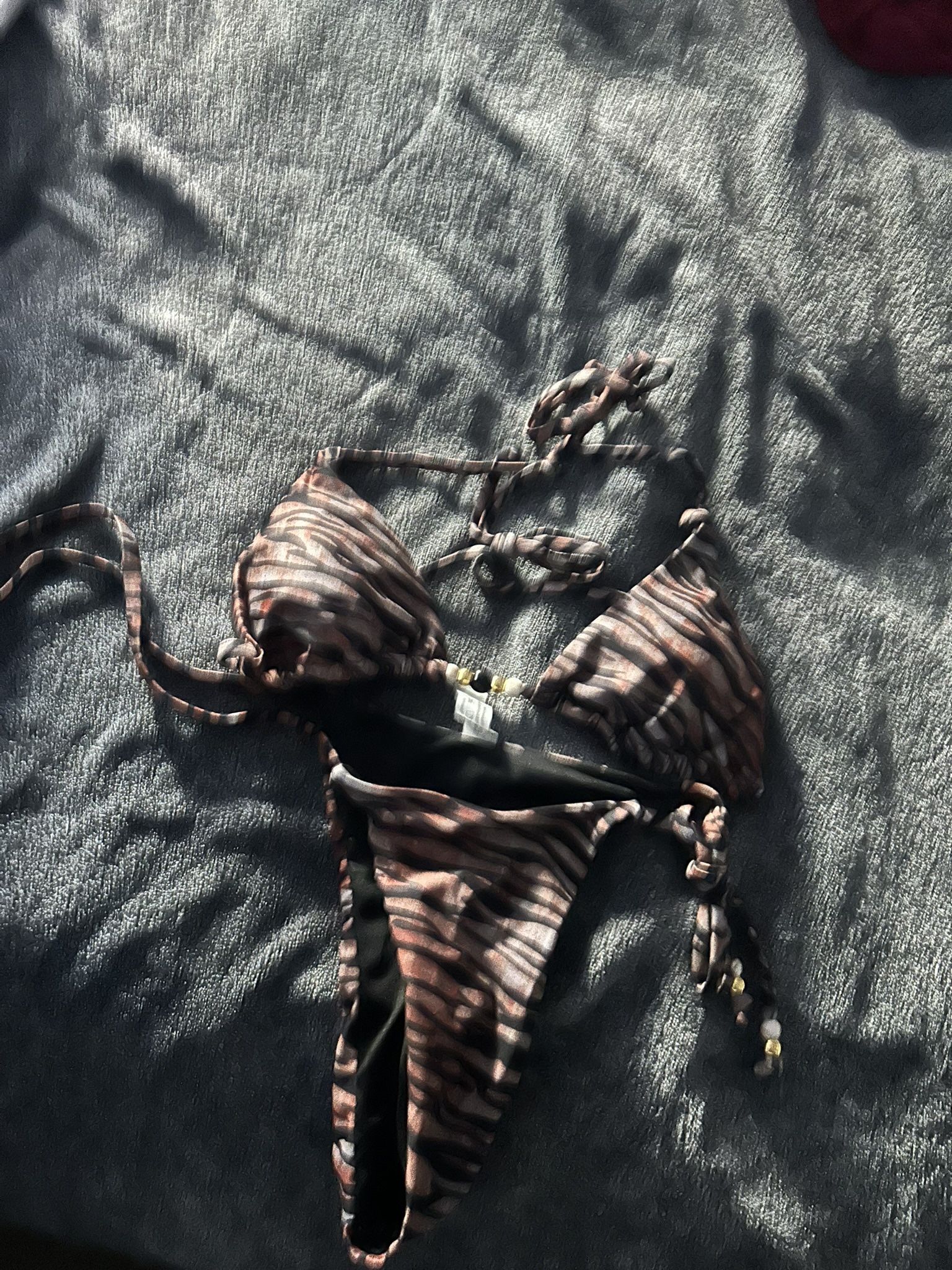 brown and cream animal print triangle bikini set with tie details and gold-toned beads.
