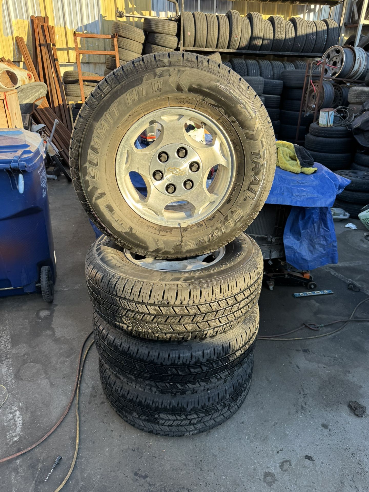 Set of four rims for chevy trucks Tires have plenty of life left Make an offer