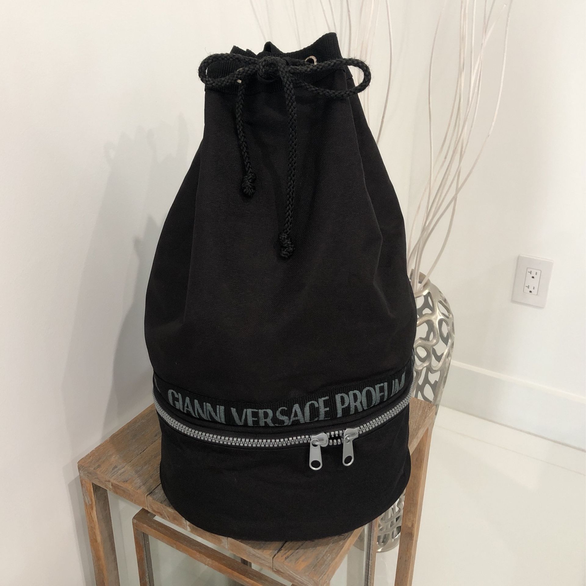 Large Gianni Versace Profumi black drawstring backpack . Identical one selling on Mercari for $160.00