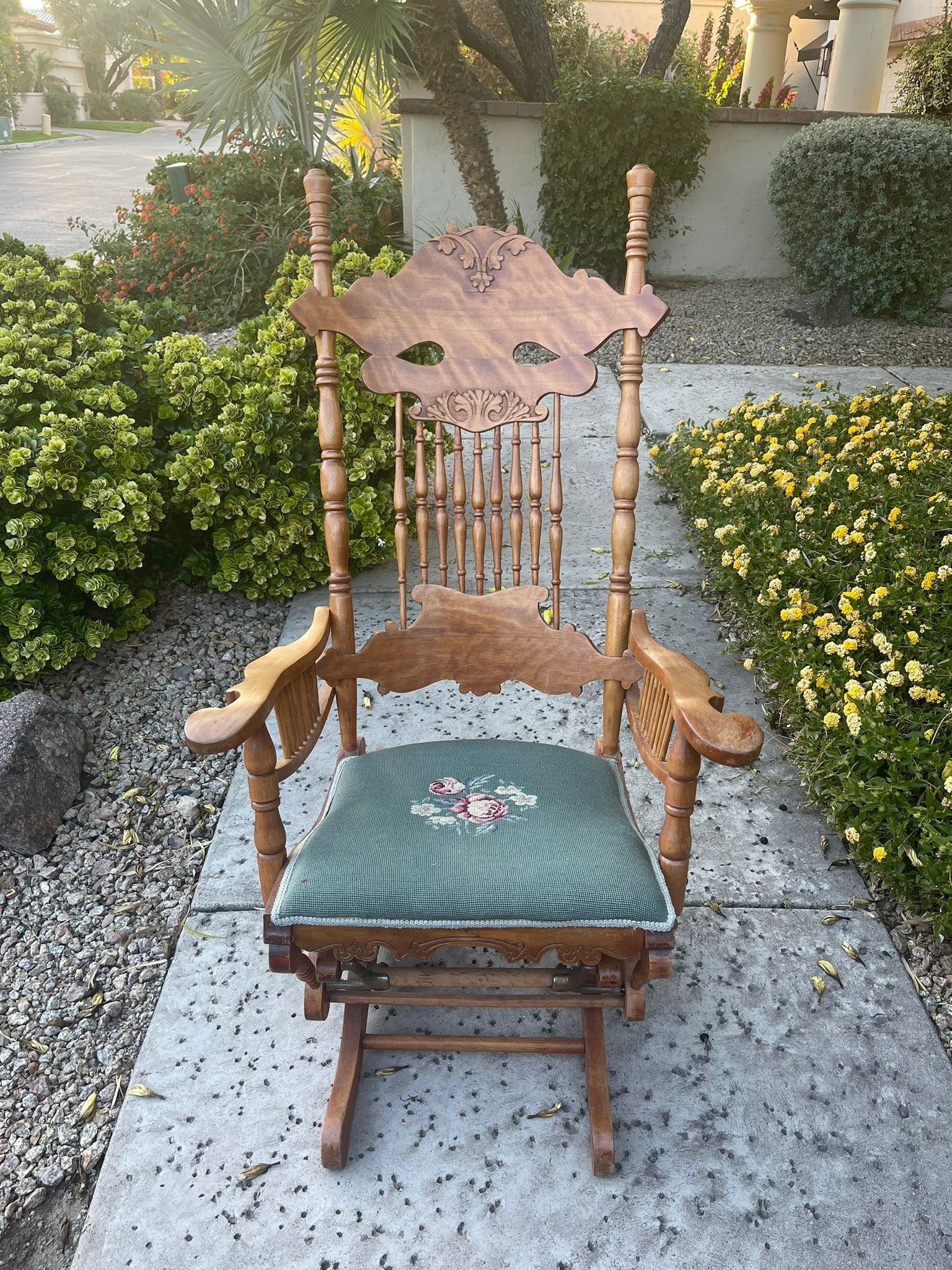 Antique Carved Wood Rocking Chair with Cross-Stitched Cushion