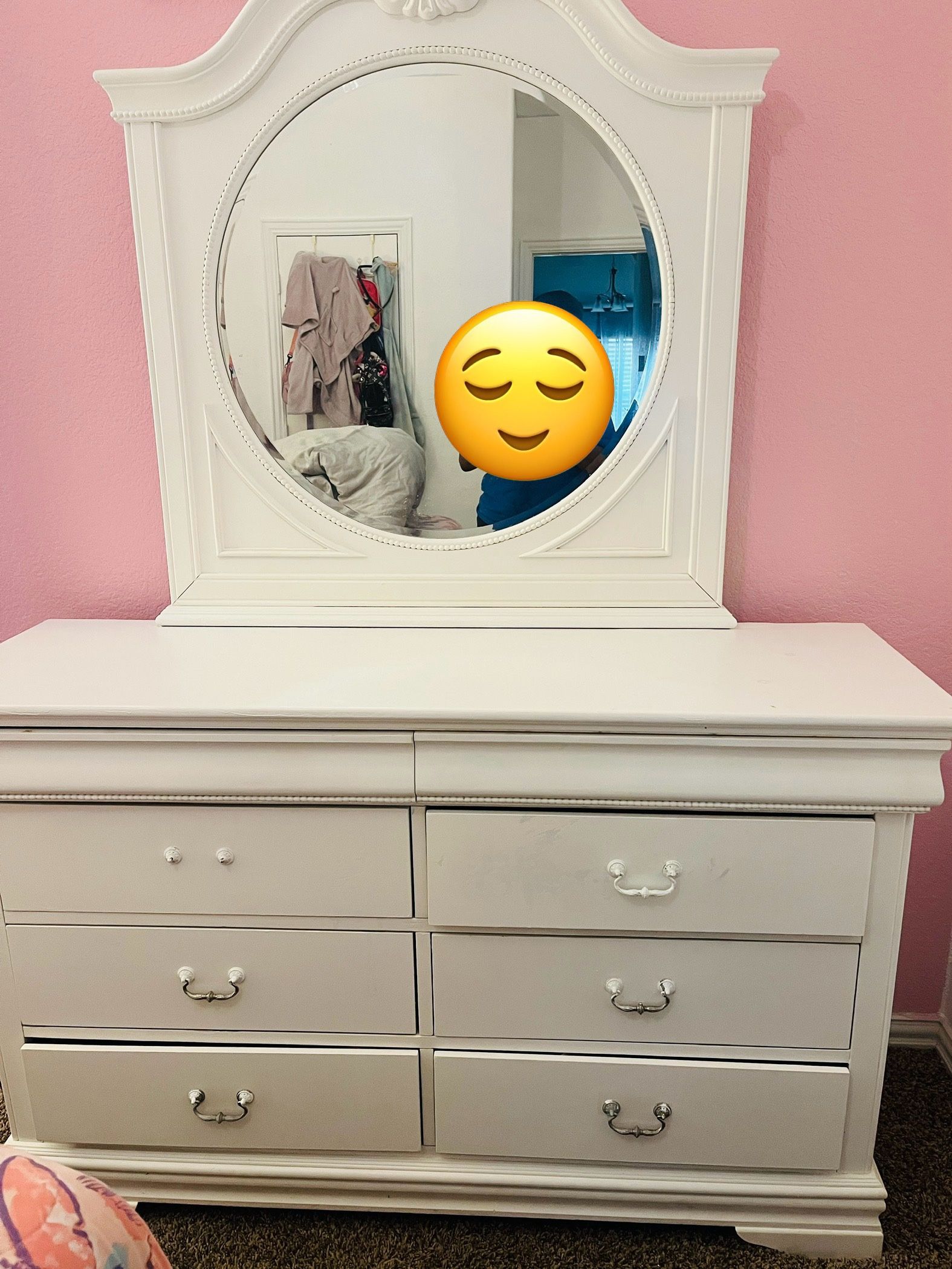 Gorgeous White Bedroom Set – Includes Bed Frame, Nightstand, and Dresser with Mirror Bring charm and elegance to your bedroom with this beautiful white bedroom furniture set. Perfect for a child’s room, guest space, or anyone who loves a clean, classic look with a touch of whimsy! Set Includes: Full Bed Frame: Ornate carved headboard with vintage-inspired detailing. Dresser with Mirror: Spacious 6-drawer dresser with a matching mirror featuring curved molding. Nightstand: 2-drawer nightstand with silver-tone hardware and elegant design. Condition: Gently used with some signs of wear (light scuffs and small paint marks ,could be refreshed with a quick touch-up or left as-is for a shabby chic style Pickup Only | Priced to Sell 💲Priced to Sell | Pickup in [Your City] Beautiful white bedroom set perfect for a girl's room, guest room, or anyone who loves a soft, classic style! 🦋 Bedding and decor not included (but can be added for extra if interested) 🎀 Great for a princess or butterfly-themed room! 💬 Message me with questions 📍Pickup only