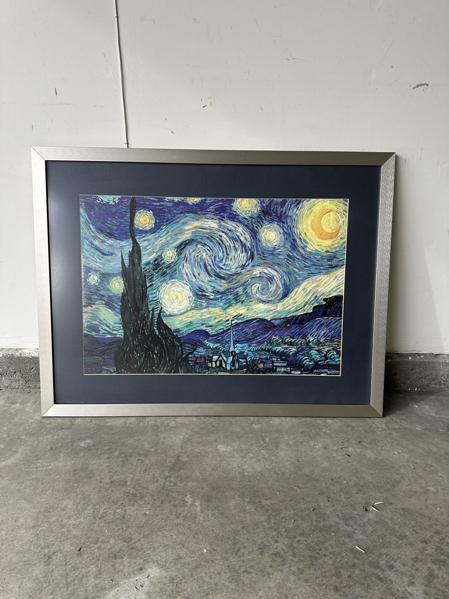 Starry Night framed print. Framed and matted at Art Plus Gallery. The picture has a 3/4 inch brushed aluminum frame measuring 37 1/2 in length and 28 1/2 in height. The frame is in good condition. Please look at my other posts for more furniture and home goods.