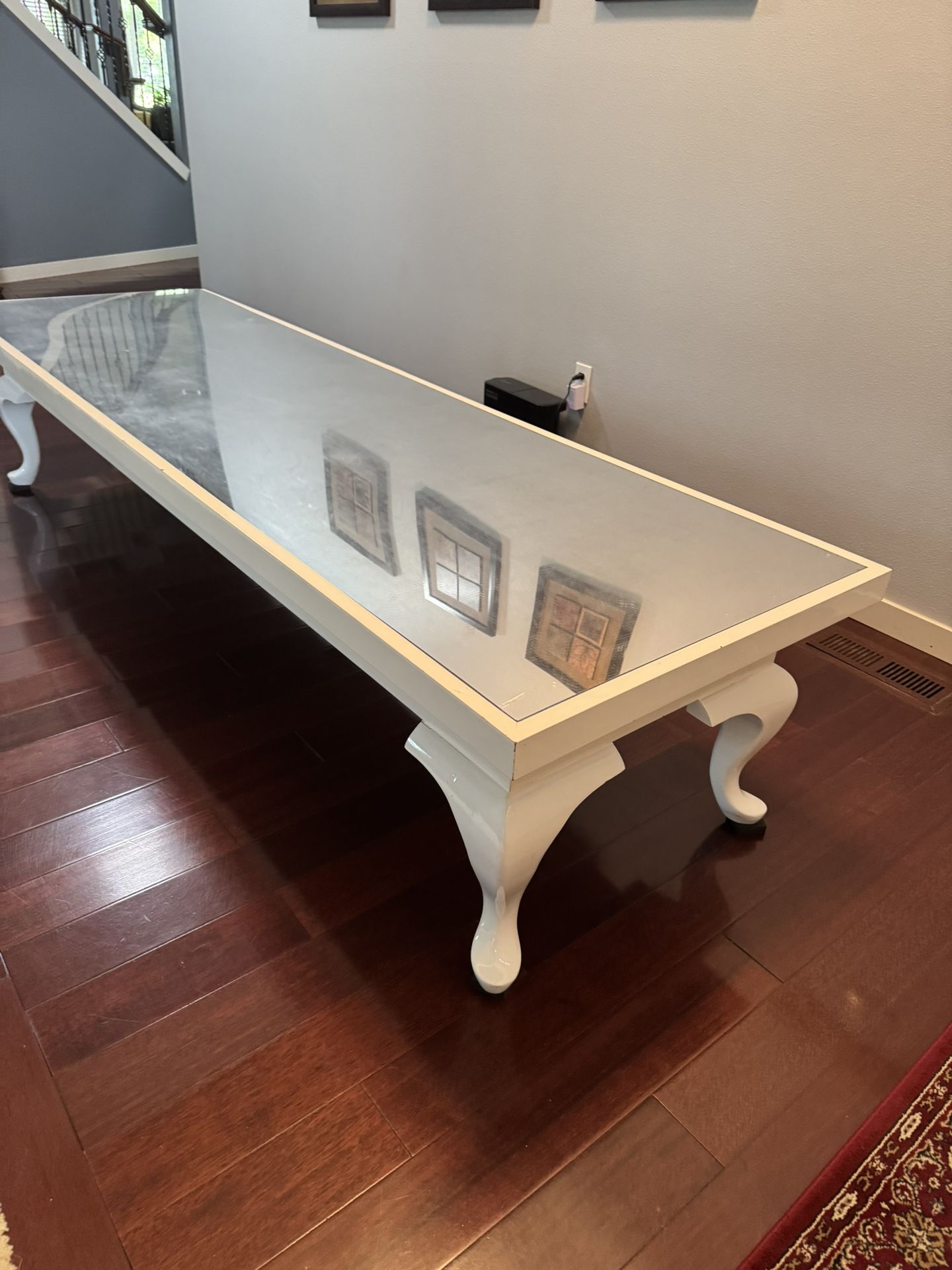 Beautiful white fancy table with a plexiglass mirror. The table is very heavy and will need 2-3 people for transportation. Table Measurements: H = 21” W = 30” L = 96 Will not deliver as it is too heavy and too long. This table was used in the mall for decoration and placement originally