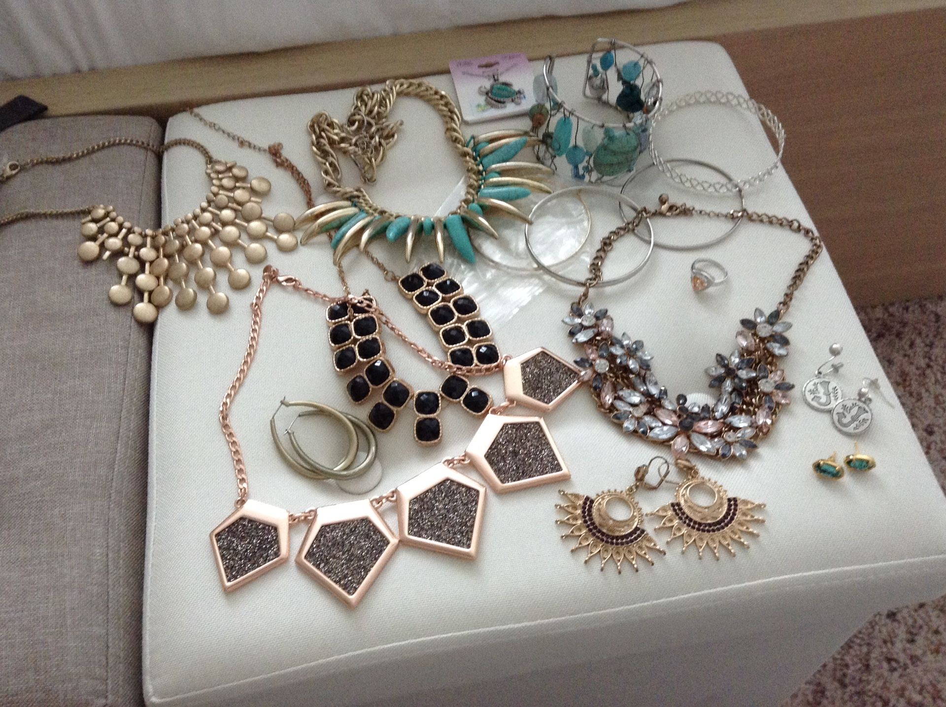 Custom jewelry, including 5 necklaces, 4 pair of earrings, stone Aqua bracelet, and a women's ring, Childs necklace and bracelets.