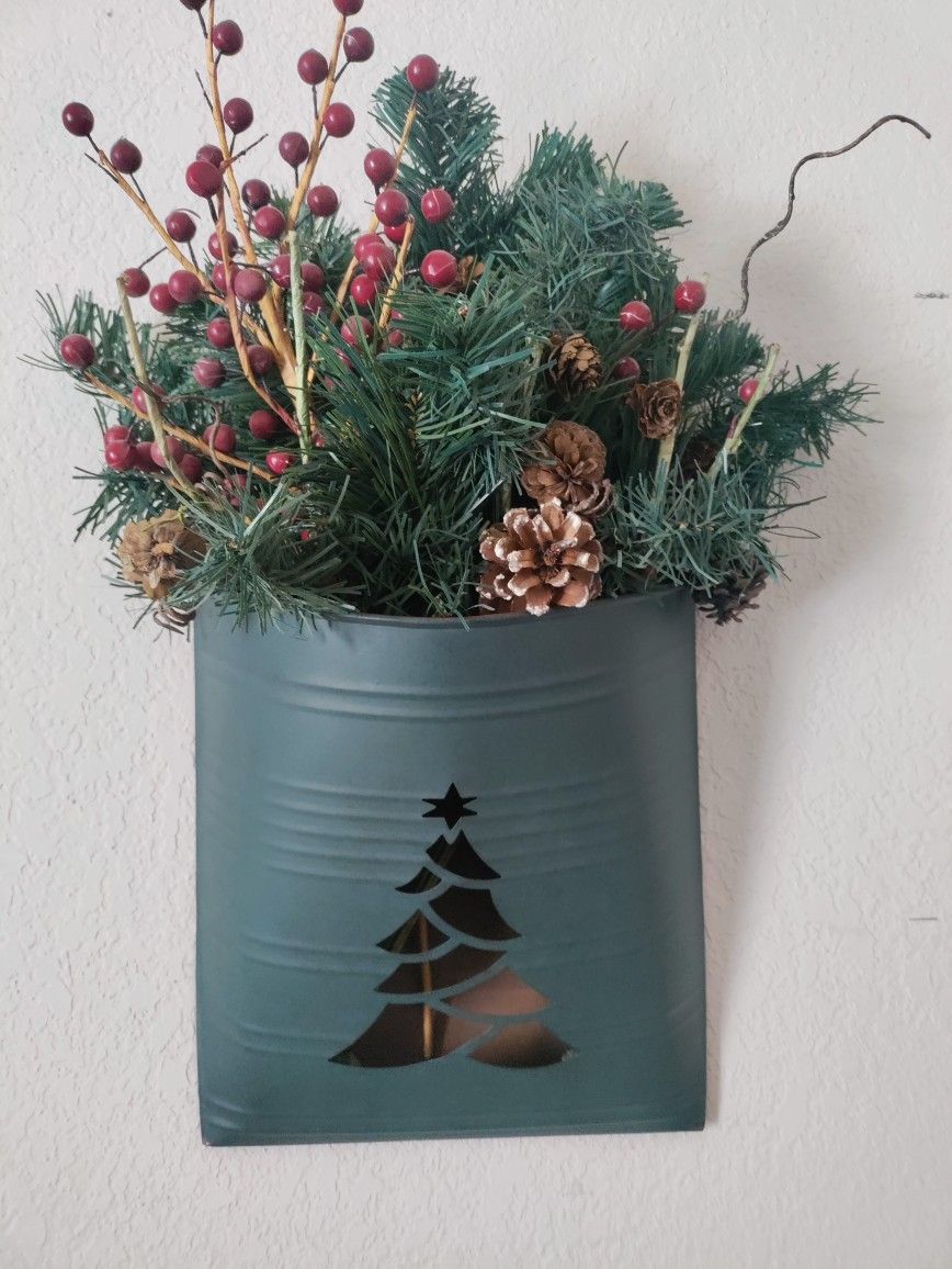 Christmas wall decor tin container in a hunter green with Christmas tree branches and berries for added color. Makes a nice decor for any room or place. Measures 17" - H 10" - W