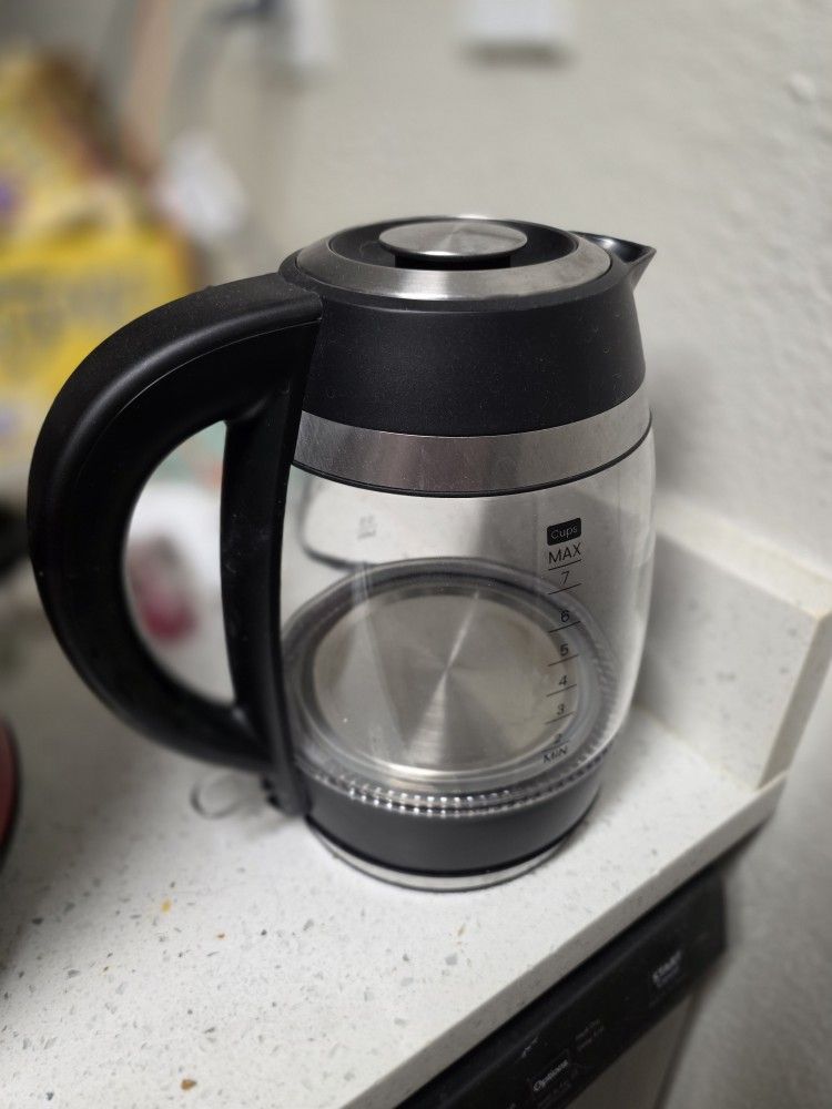 Like-new Chefman electric tea kettle. Made of high-quality borosilicate glass so you can see the water boil. It features a beautiful blue LED light that glows while it’s heating up. * **Capacity:** 1.8 Liters (Large) * **Safety:** Features auto shut-off and boil-dry protection. **Condition:** Spotless and works perfectly. **Price:** $18 **Pick-up:** Grand Prairie. Cash or Venmo.