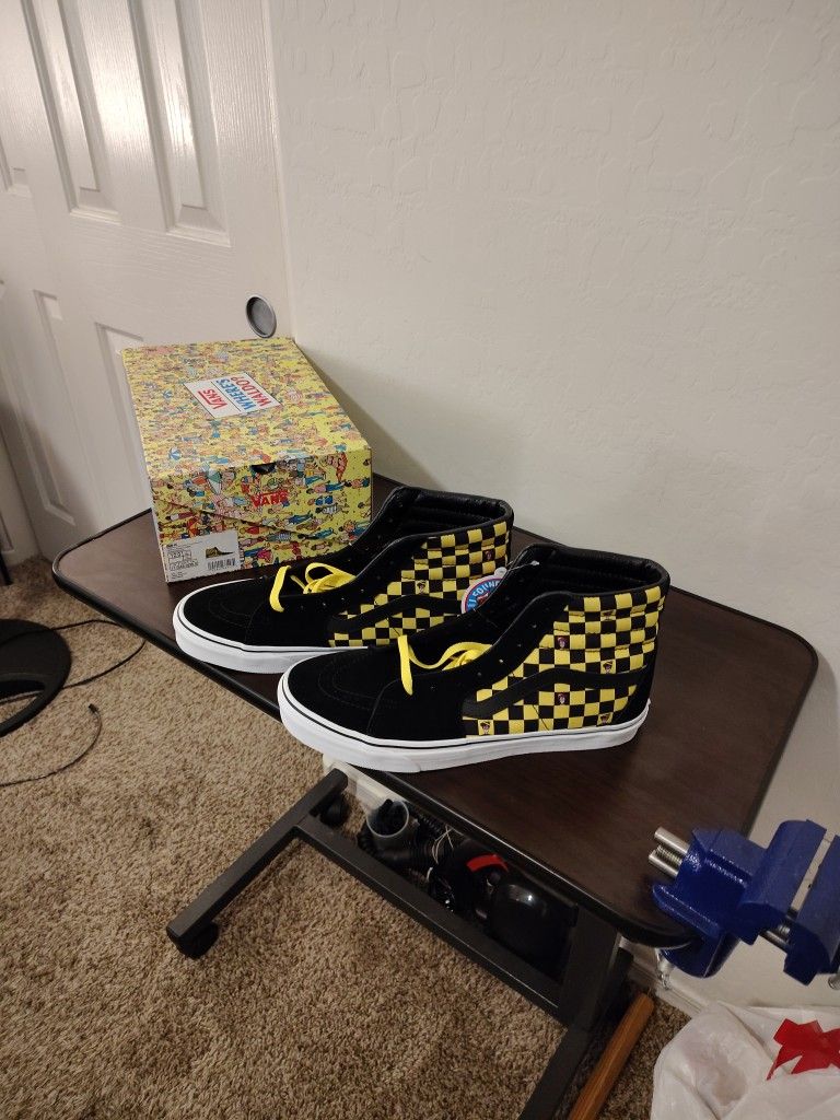 Brand new, never been worn mens size 12 Vans. These are special limited edition "where's waldo" black and yellow high tops and they come with the original box. Again they are brand new and have literally never been worn.