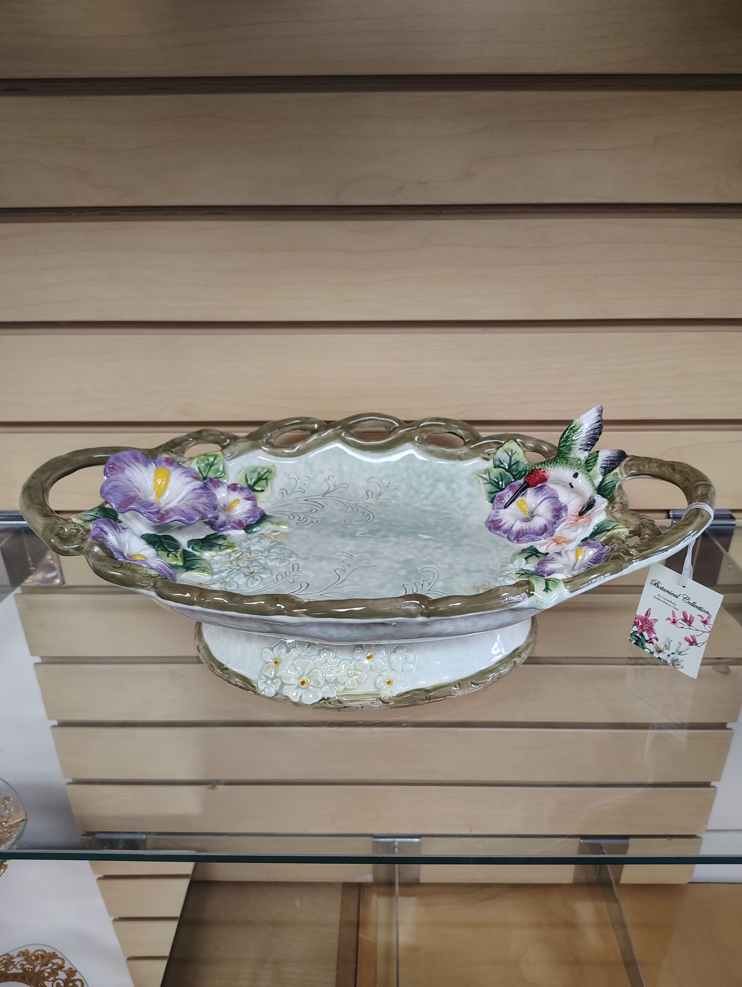 Decorative Vase / Basket with handles Material - ceramic Color - green / purple / teal ( multicolor ) as shown Length - 15 inches Width - 9.5 Height - 4 inches Condition - NEW Location - 4700 s 900 e Murray UT 84117 Ivy Place Shopping Village