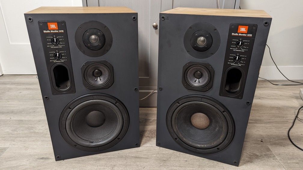 This is a pair of professional-grade JBL 4410 Studio Monitors. I would rate the sound quality as excellent. I would rate the physical condition of one as good/excellent, and the other as good/fair. They have a really great, clean sound throughout the power range and a nice tonal balance. In my opinion, these speakers deliver the best performance from 70s rock (think Zeppelin, the Who, or Fleetwood Mac), but they really adapt well to modern styles as well. The monitor that is in fair condition has a woofer that might need a new cone for a better look and has a slightly lighter wood grain on the top surface. I do have the standard dark blue grills, that are also in decent condition, but one has a couple of broken fittings on the back and is missing the JBL nameplate. Both monitors have wall mounting hardware attached to the rear panel. These mounts can be removed if desired. The monitors weigh about 40lbs each, so it would need a pretty strong wall, ceiling, or stand upon which to mount them. These speakers are large bookshelf-style front-firing speakers, using a 3-way set of drivers in a vented cabinet. The drivers include a 10” woofer, 5” midrange, and 1” metal dome tweeter. Each monitor is encased in oiled walnut panels.