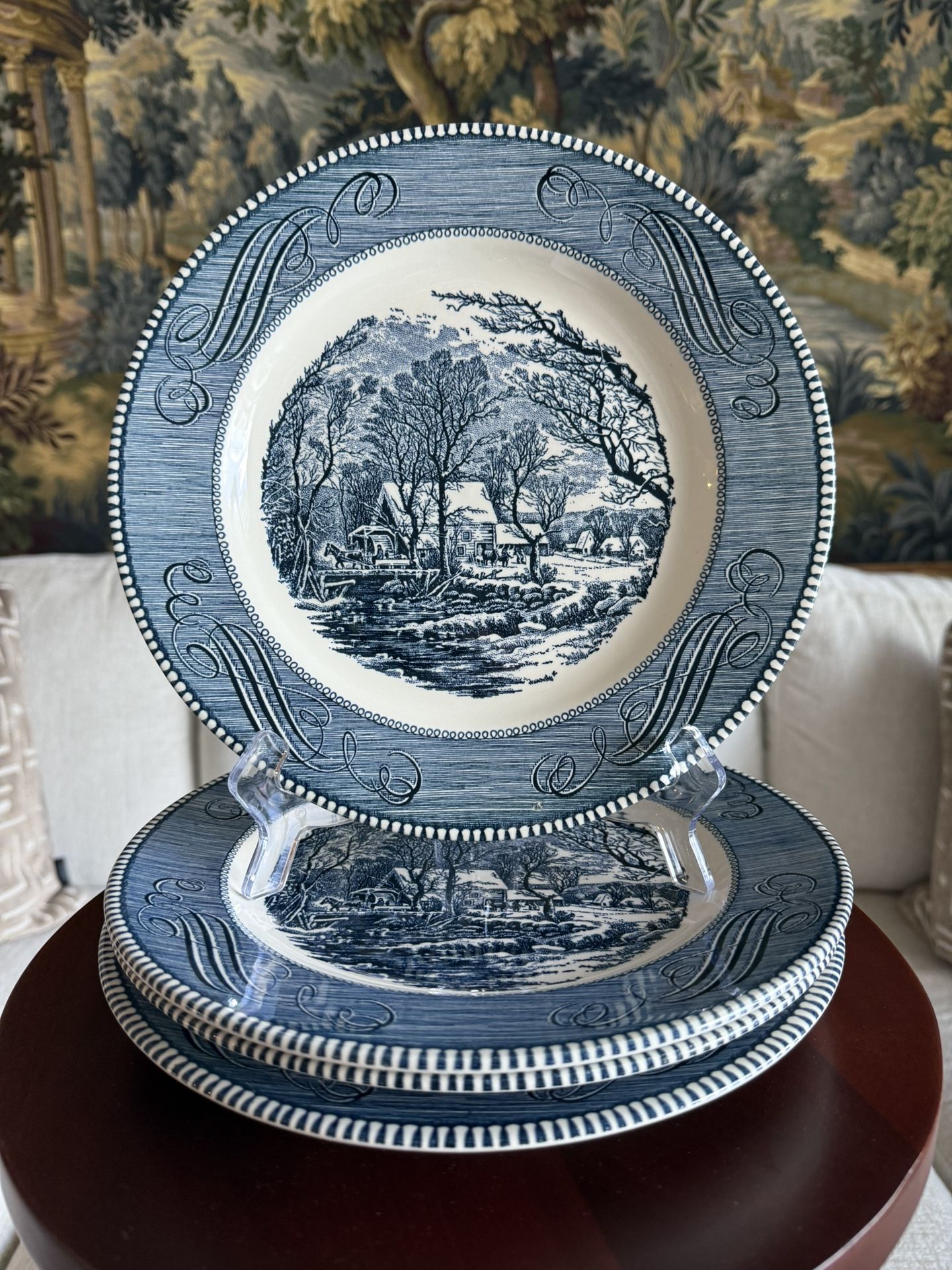 4 CURRIER & IVES The Old Grist Mill 10" Dinner Plates Disclaimer: 1 small chip on back of one.