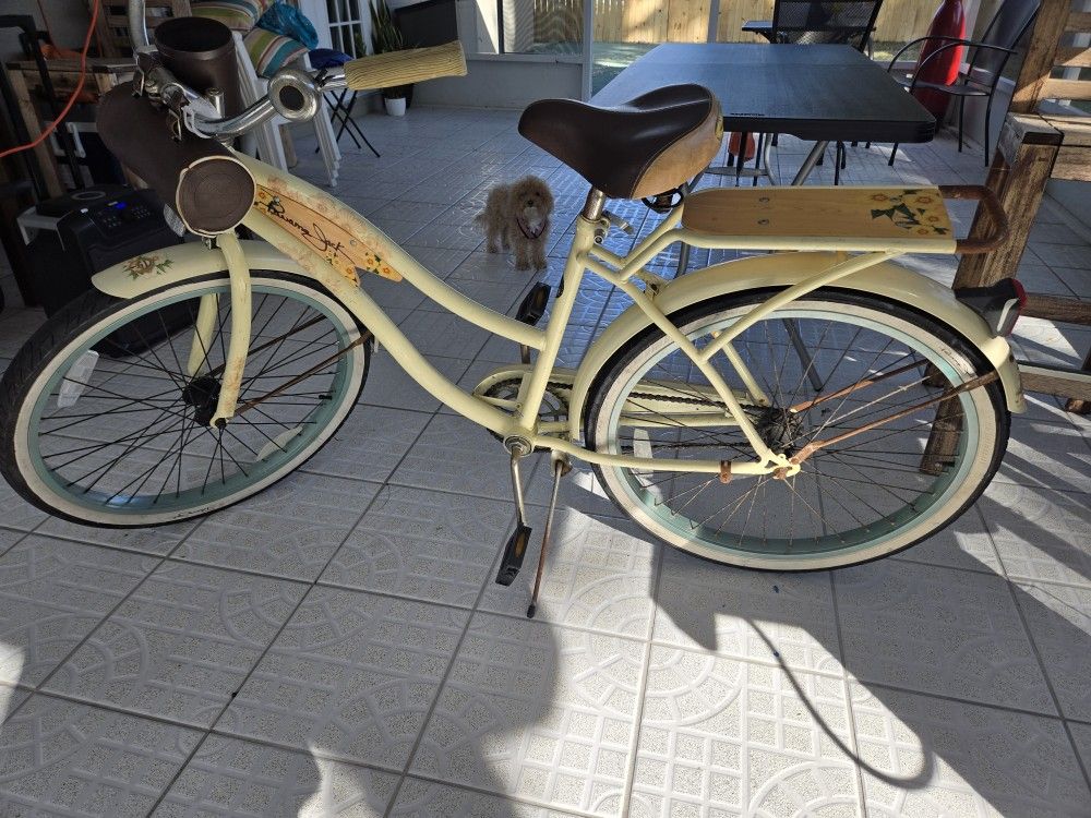 Women’s Cruiser Bike | Huffy Panama Jack Super cute cruiser, Cream Colored with floral details Most likely fits anyone 5’ - 5’7 *Ready to ride, works perfectly fine Includes: - Original seat as well as extra seat for more comfort - Kickstand - Handlebar grips - Bottle holder - Rack on back that holds up to 25lbs - One speed