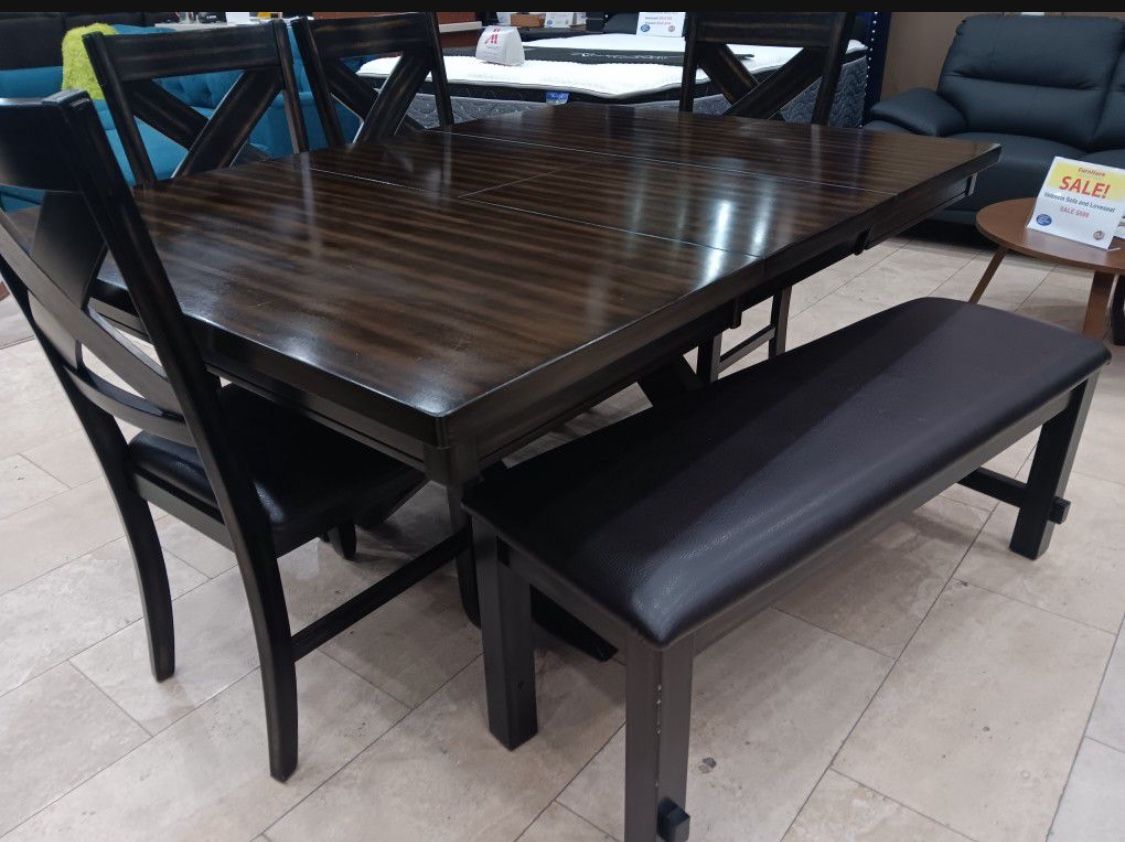 Kelly dining table with four chairs and bench now only $699. Easy finance option. Same day delivery.