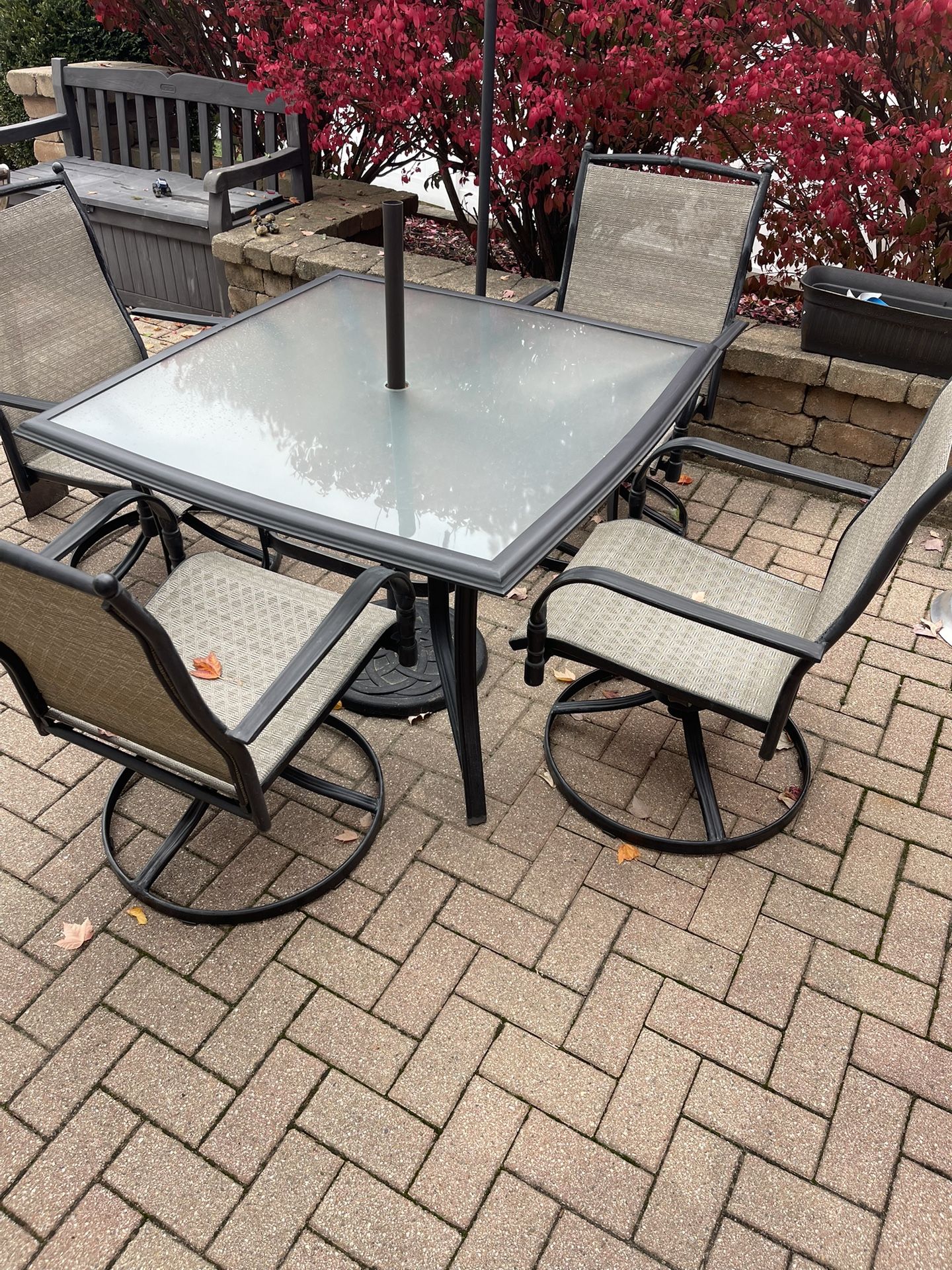 Outdoor patio table with 4 chairs. Umbrella stand not included