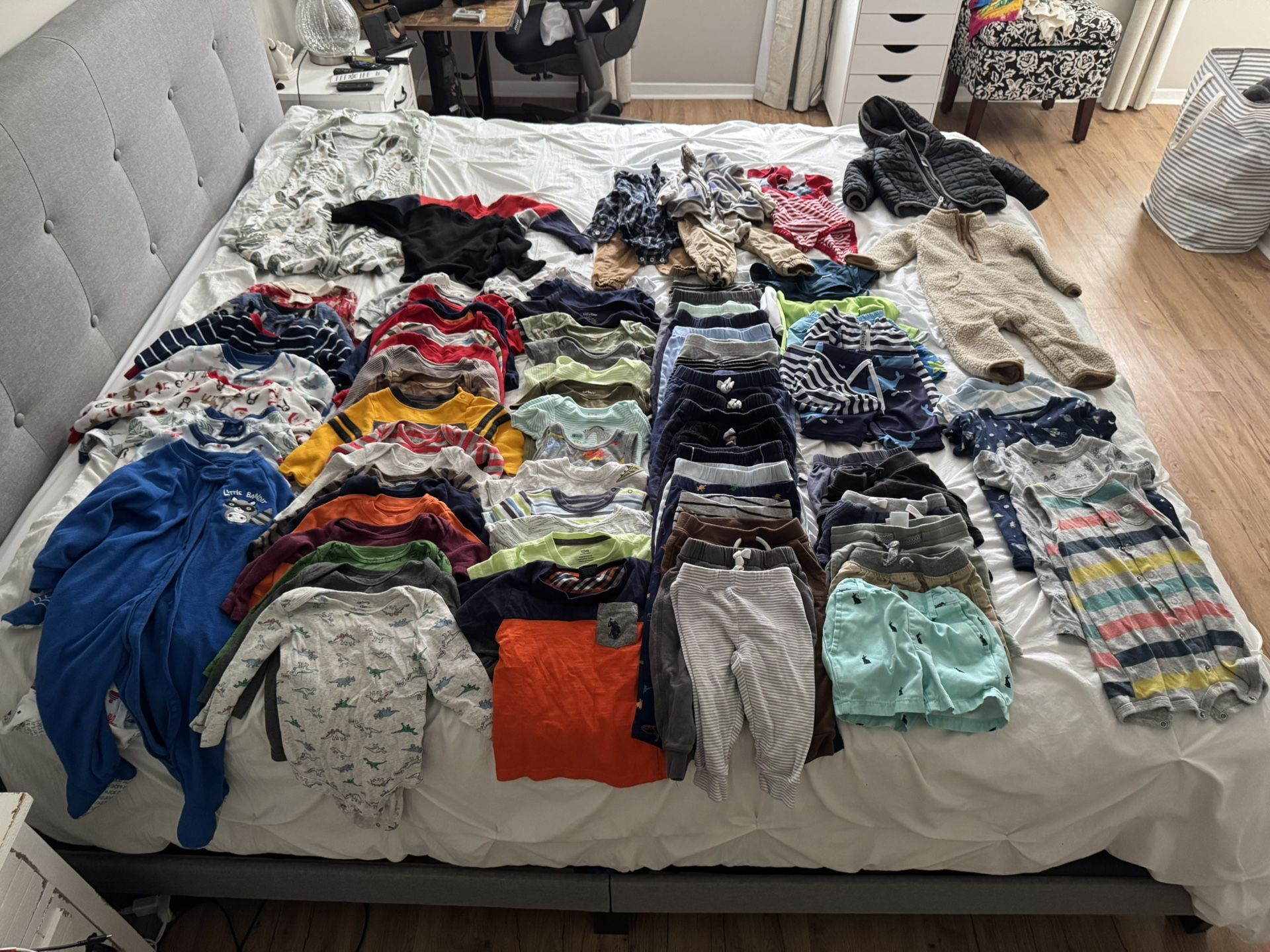 8 pjs 3 sleep sacks 20 long sleeve onesies 2 long sleeve shirts 9 short sleeve onesies 5 short sleeve shirts 19 long pants 6 short pants 2 swimsuits 4 rompers 3 outfits 1 jacket 1 Pick up near north point mall