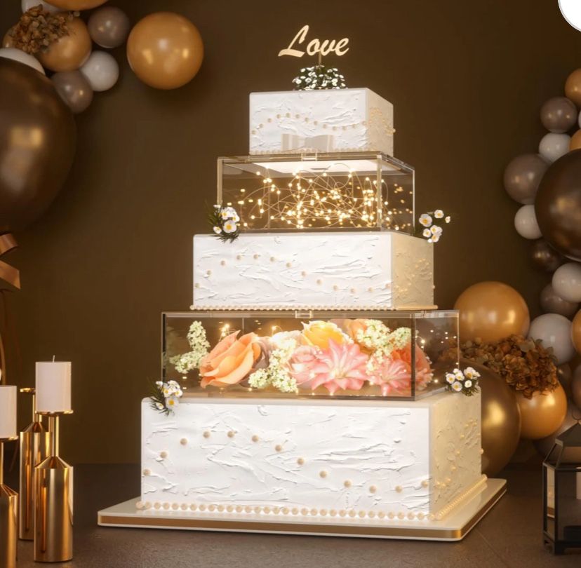 Two piece clear acrylic cake, stand, fillable cake, box, riser, cake, tear square cake display box with lead decorative centerpiece box. (2pc, 10”D x 4”H)(6” Dx 4 “ H 2 M LED Lights) Regular $31.99