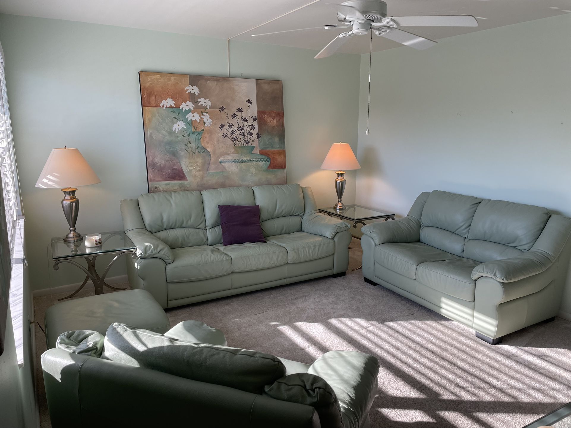 Stationary sofa and loveseat, over stuffed chair, ottoman, glass coffee table with silver metal stand, two matching end tables, two glass lamps with white cloth shades. Very large picture.