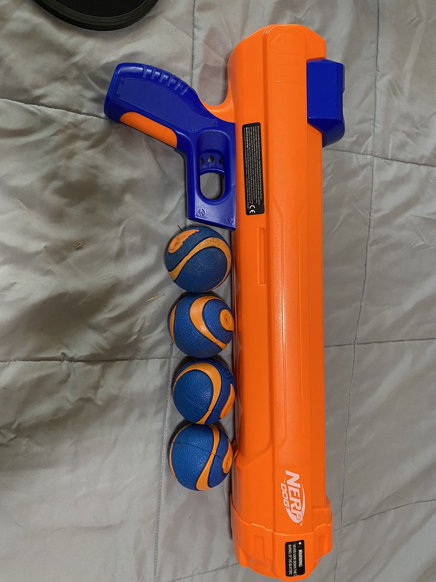 $30 or best offer. Nerf Dog Tennis Ball Blaster Dog Toy Gift Set β Launches Up to 50 ft! Make fetch more exciting with the Nerf Dog Tennis Ball Blaster! This interactive dog toy launches tennis balls up to 50 feet, keeping your pup entertained and active. Perfect for dogs of all sizes and energy levels, this blaster is a great way to bond with your furry friend while giving them the exercise they crave. Features: πΎ Hands-Free Pickup β No more slobbery hands! Easily reload without touching the ball. πΎ Launches Up to 50 ft β Adjustable power for indoor or outdoor play. πΎ Includes 3 Dog-Safe Tennis Balls β Soft, durable, and safe for canine teeth. πΎ Ergonomic Design β Comfortable grip for effortless launching. πΎ Great for All Breeds β Whether small or large, your dog will love chasing after the ball! Perfect as a gift for dog lovers, this translucent blue Nerf Dog Ball Launcher takes fetch to a whole new level. Get ready for endless fun and exercise with your pup! πΆπ NERF-TOUGH: Nerf-quality materials make our Large Tennis Ball Blaster perfect for fetch and for teaching your dog new tricks EASY OPERATION: Operating the blaster is as easy as pulling back on the handle, loading the ball, and taking your shot GOES THE DISTANCE: Skyrocket tennis balls up to 75 feet! With adjustable power, you can easily change the distance of your shots and adapt to any environment, whether it is a big park or a small garden FOR SMALL, MEDIUM AND LARGE BREEDS: Smaller diameter ball is great for dogs of all sizes SAFETY FIRST: Designed with your dog's safety in mind, each of our dog toys are tested to ensure endless hours of family fun Dog Toy Ball Launcher: Dog toy gift set includes one Nerf Dog Tennis Ball Blaster and three dog fetch balls; additional Nerf Dog Tennis Balls sold separately Easy to Use: Using this dog ball thrower is as easy as pulling back on the handle, loading tennis balls and taking your shot; keep your hands dry with the hands-free pick-up Goes The Distance: Skyrocket dog tennis balls up to 50 feet or use the adjustable power to easily change the distance of your shots to use this dog fetch toy in any environment Dog Toys for Small, Medium and Large Dogs: These Nerf Dog tennis balls have a smaller diameter than standard tennis balls, making this handheld fetch machine perfect for dogs of all sizes Safety First: Nerf Dog toys are designed with your dog's safety in mind, made with Nerf Tough quality materials and tested to ensure endless hours of family fun