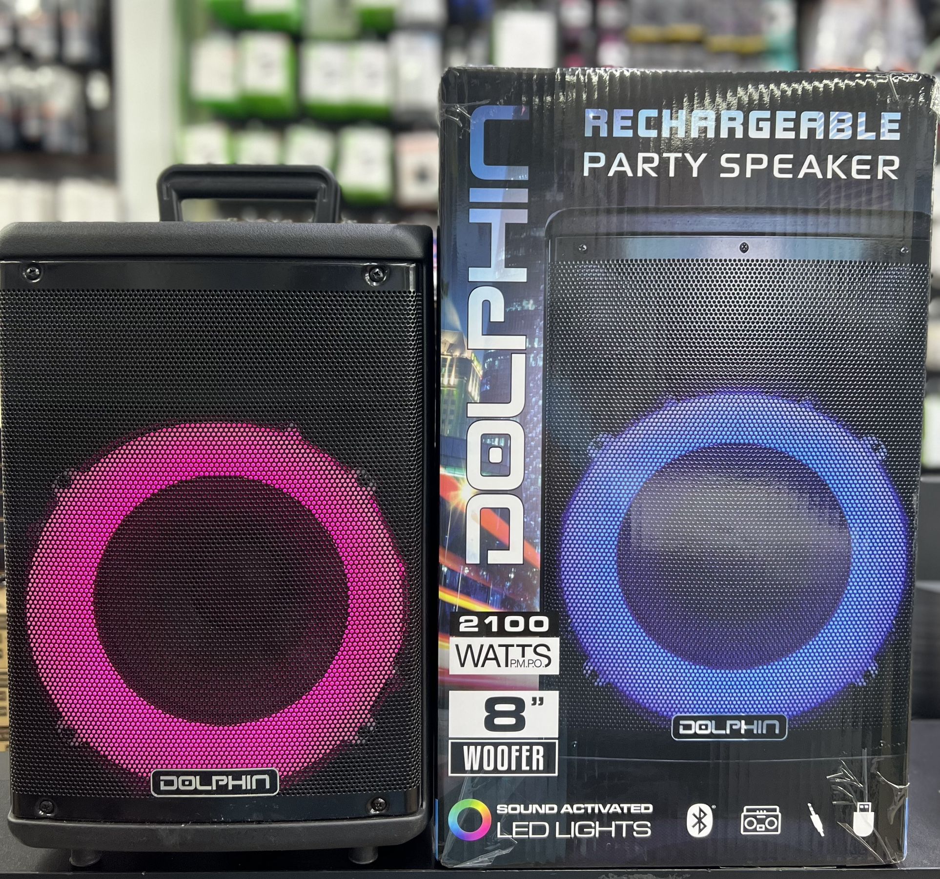 - Wired mic included - 8” woofers - 2100 watts - Rechargeable - Handle for easy accessibility - Bluetooth - USB port