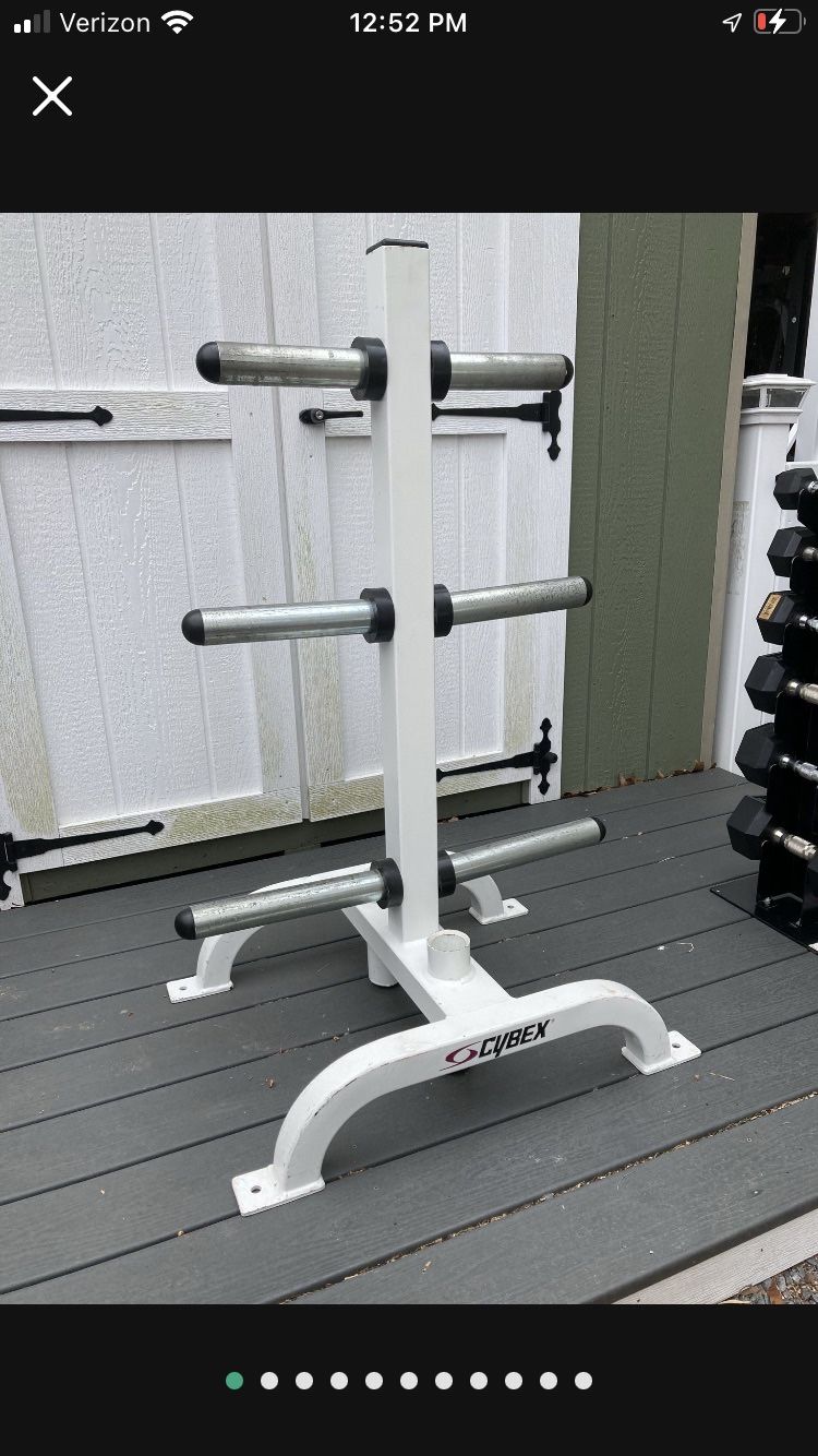 Commercial quality solid build. Not like the cheaper weight trees. Perfect for organizing your weights. Fits Olympic 2” weight plates as well as bumper plates. Needed for any home gym. Very strong. Have had over 800 Lbs on this tree with no issues. Retails for over $500 brand new from Cybex. Make me an offer! No weight plates. Just the storage tree. Weights, bumper plates, olympic vertical storage tree, squat rack, adjustable bench, workout, exercise, training, CrossFit