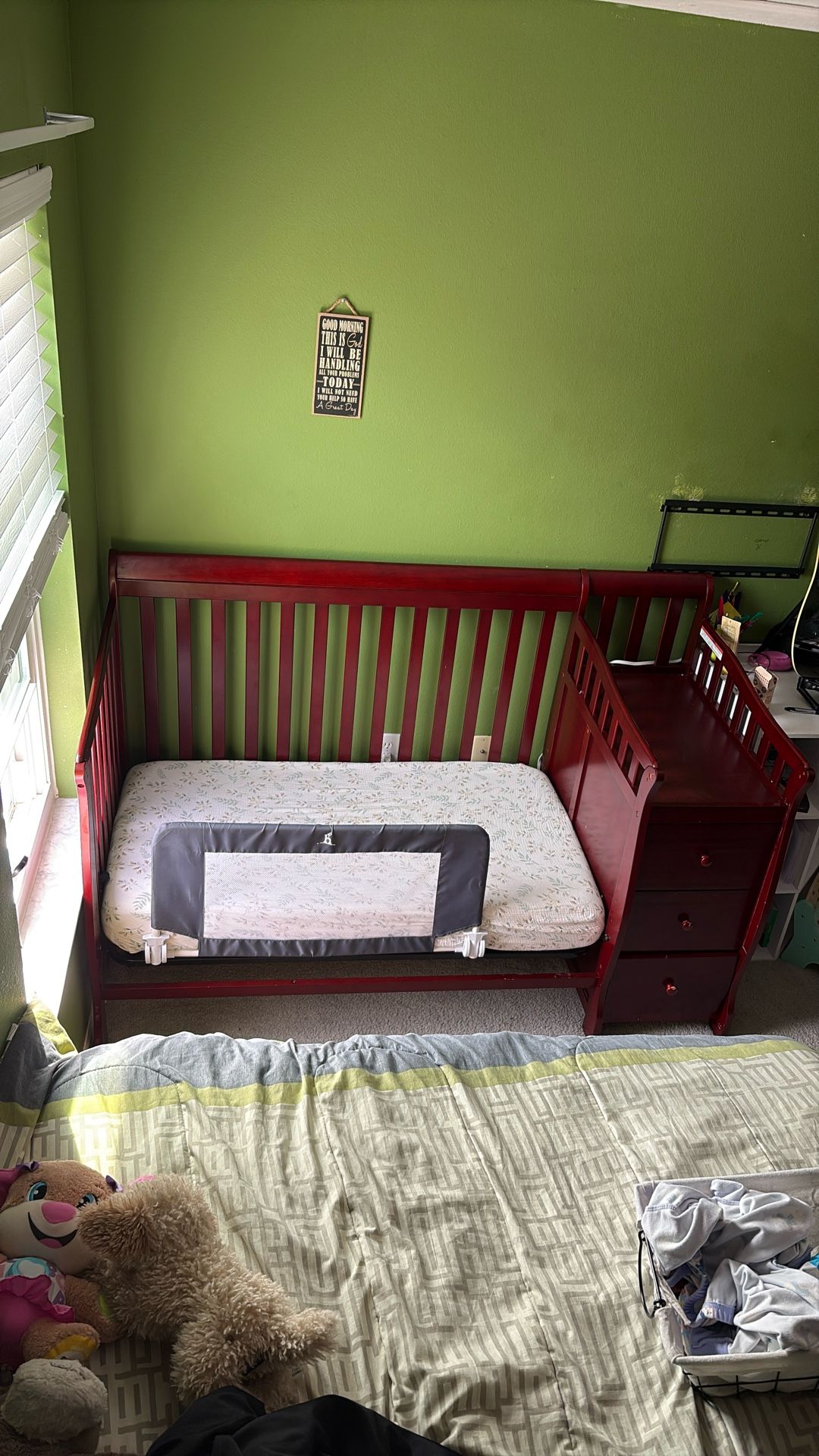 Grow with me crib. Converted to a child’s bed. Put baby down to nap in it 2-3 times over the span of her life. She is 2. Ample storage space. Selling as is. Will need to bring own tools and knowledge to disassemble and transport. Sheets barely/ never used included. Original price over $500.