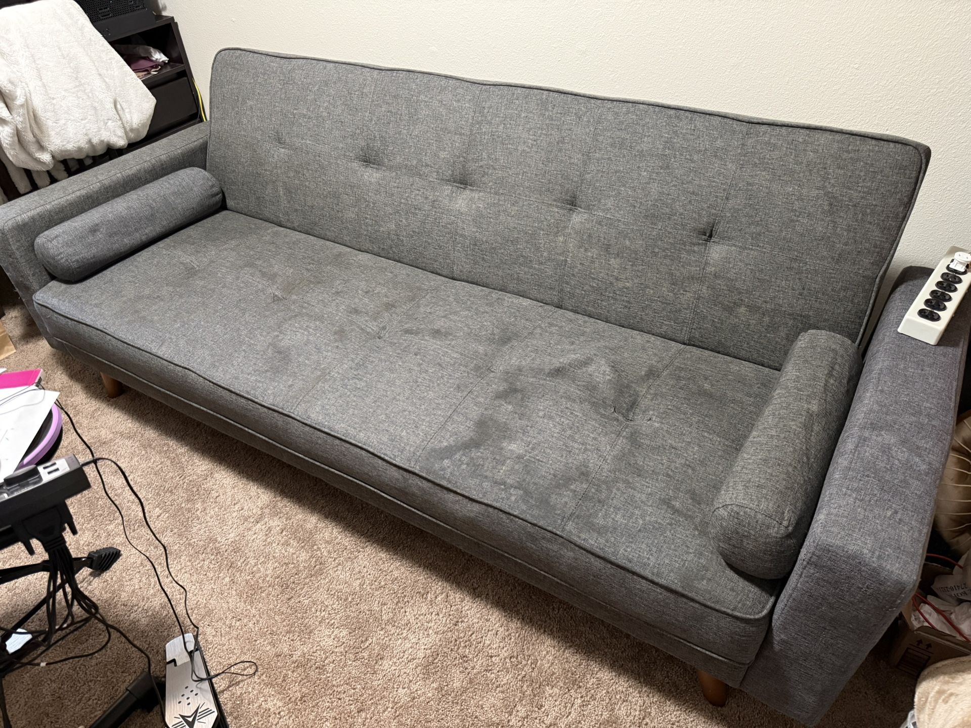 We got it from a friend who had stained it. We did try cleaning up the stains, so the couch is clean! We just didn’t end up using it. When laid flat like a bed, it’s twin size with the measurements of 44 inches by 22.5 inches and 85 inches.